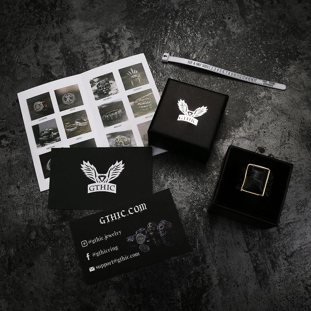 This ring is decorated with a black natural stone with irregular white lines on it. The lines on each ring stone are different, which means that what you receive is definitely a unique ring! The two sides of the ring are decorated with black zircons. The details are in place, giving the ring a super texture.
