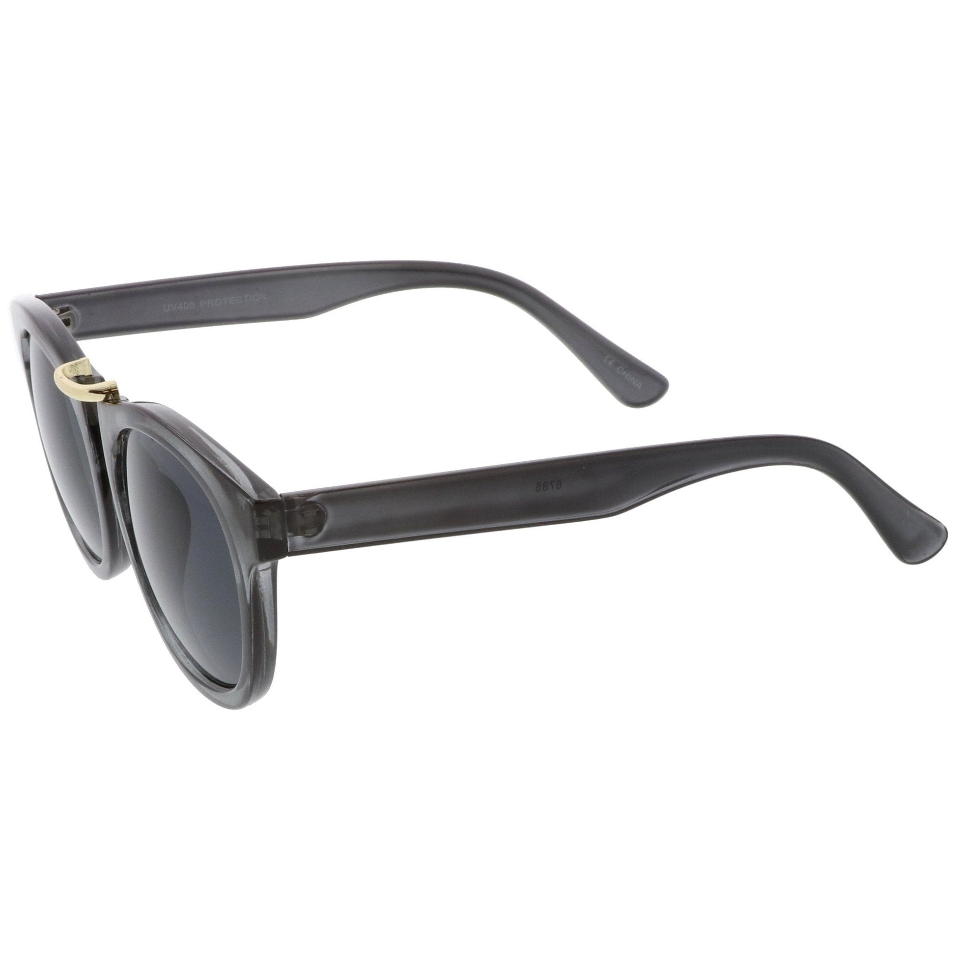 - The perfect combination of classy and sophisticated, these horn rimmed sunglasses are designed with round neutral-colored lenses for easy wear and a metal nose bridge for added luxe. Complete with stylishly wide temples that sit high on the frame, these round horn rimmed sunglasses are versatile enough to wear from season to season. Made with a plastic based frame, metal hinges, and polycarbonate UV400 lenses.