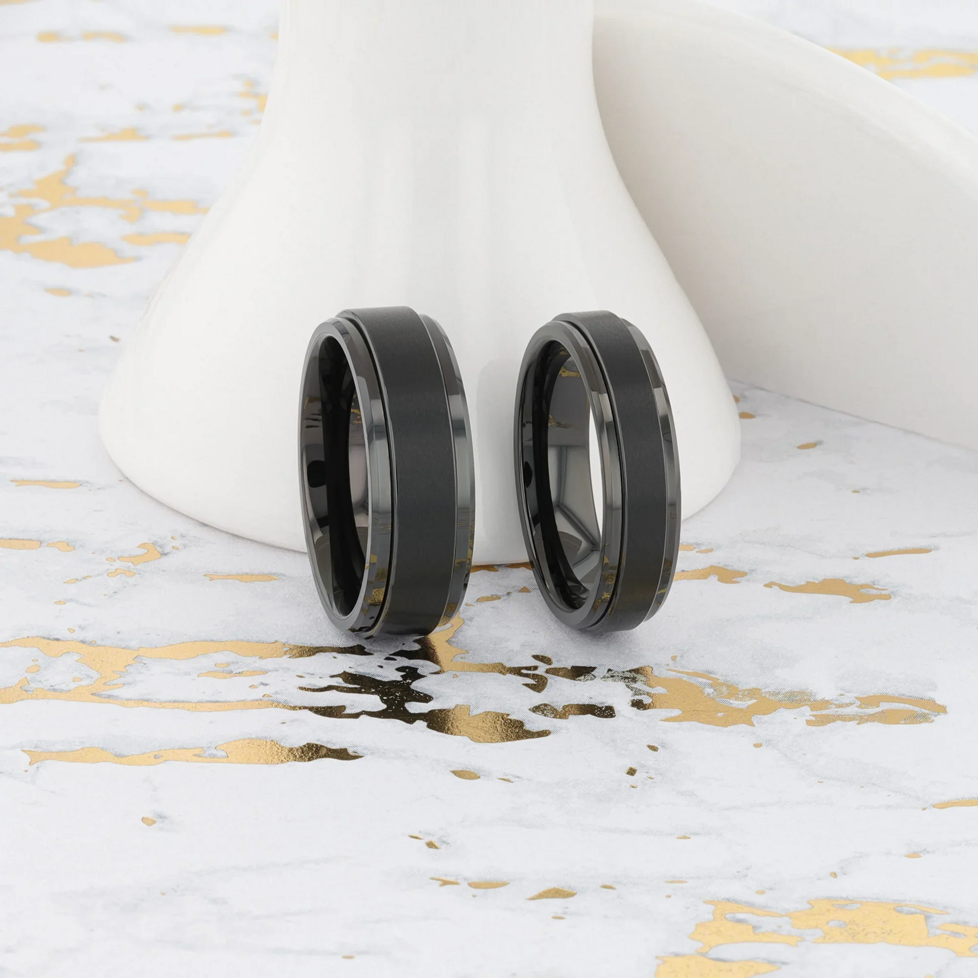 Get your beloved's heart spinning with the REVOLVE Men's Black Tungsten Spinner Ring in two different width options. This elegant spinning ring for men is made with tungsten, the earth's toughest material and will look amazing on your husband's hand. Designed with comfort and functionality in mind, this ring features a spinning center perfect for men who fidget and a polished, domed interior band that's easy to slide on. This beautiful men's tungsten spinner wedding band will spin a tale of love that lasts a lifetime.