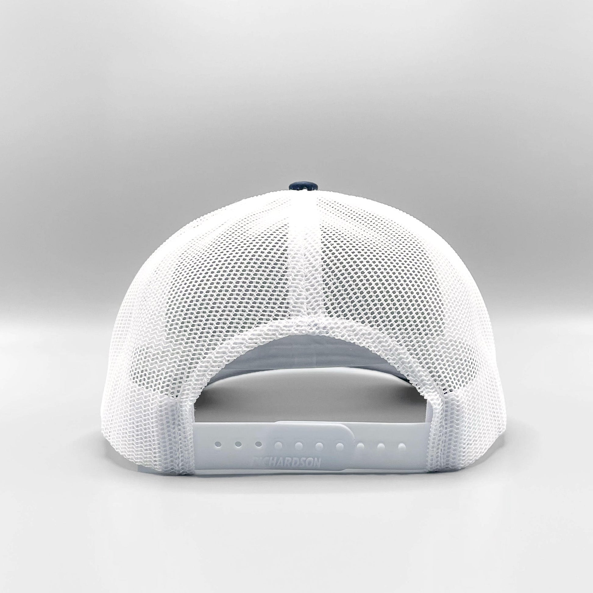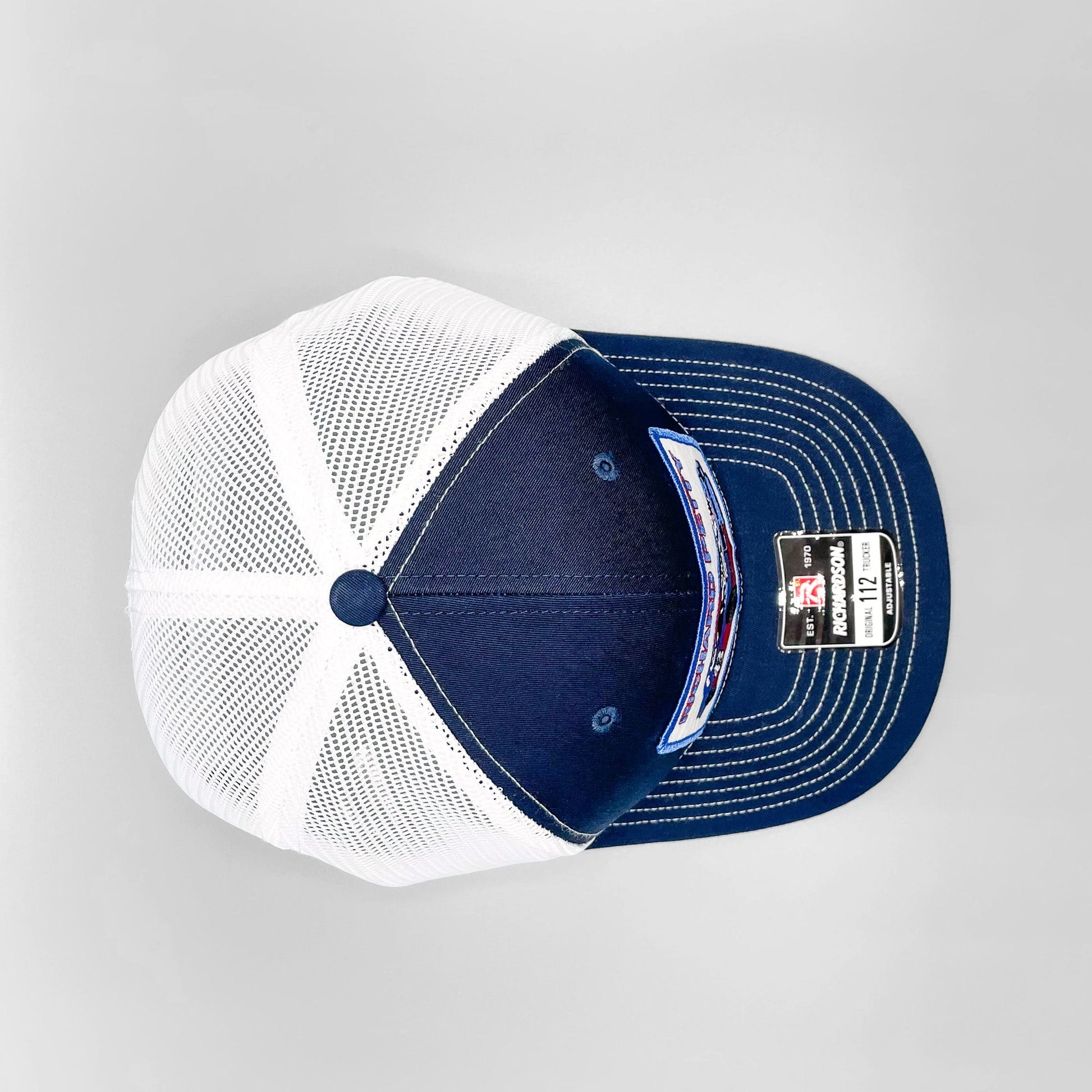 This Richard Petty STP Racing #43 Nascar Racing trucker hat features navy front panels and white mesh rear panels. This is a beautiful Richardson 112 mid-crown trucker hat with an embroidered red, white and blue "Richard Petty" Nascar Racing patch on the front of the six-panel hat.