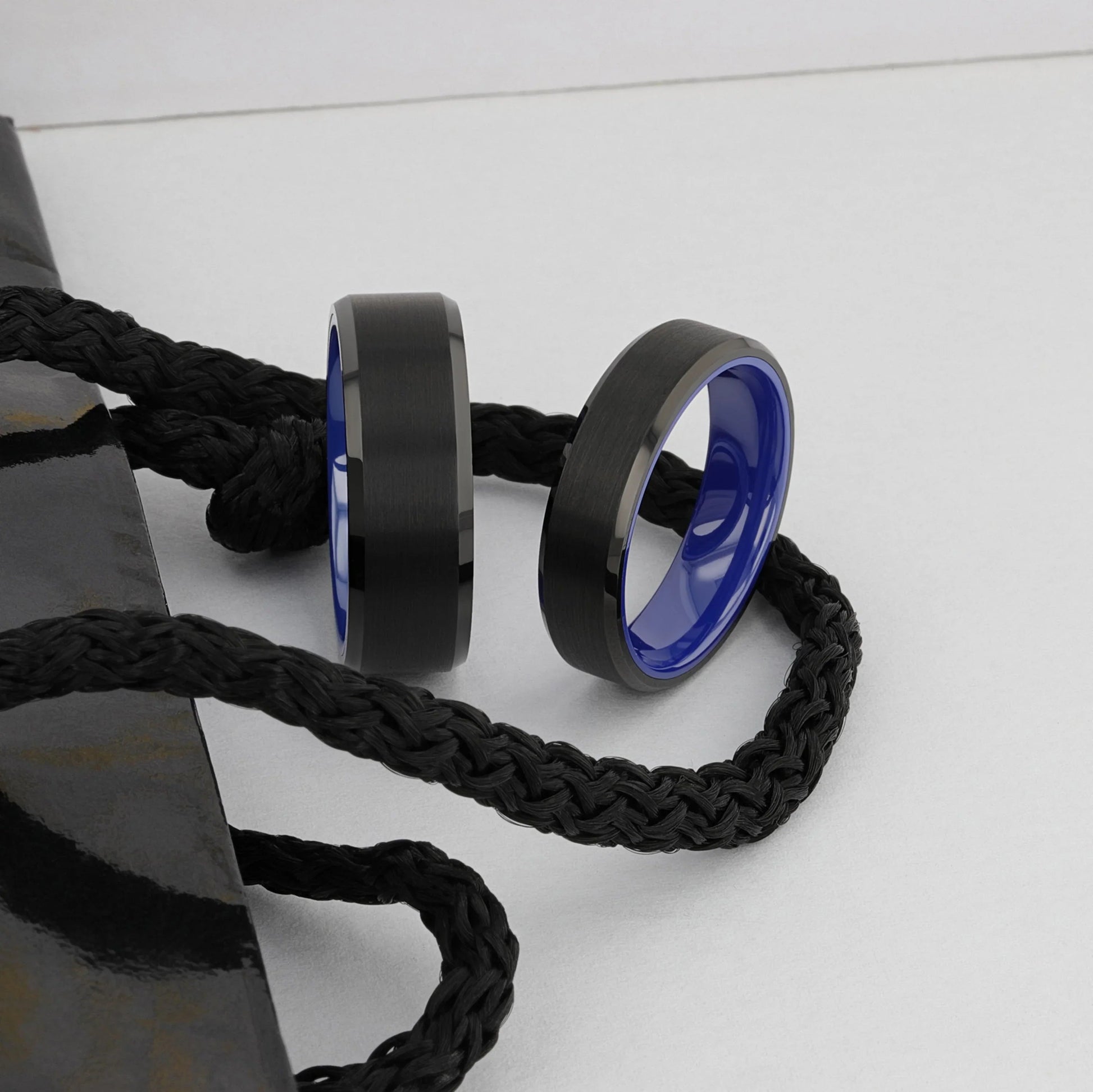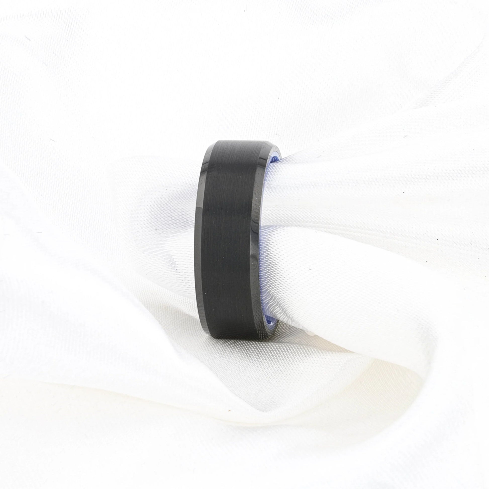 RIGEL Black Tungsten Carbide Ring – Flat Brushed Center, Polished Beveled Edges, Blue Ceramic Interior (6mm & 8mm)