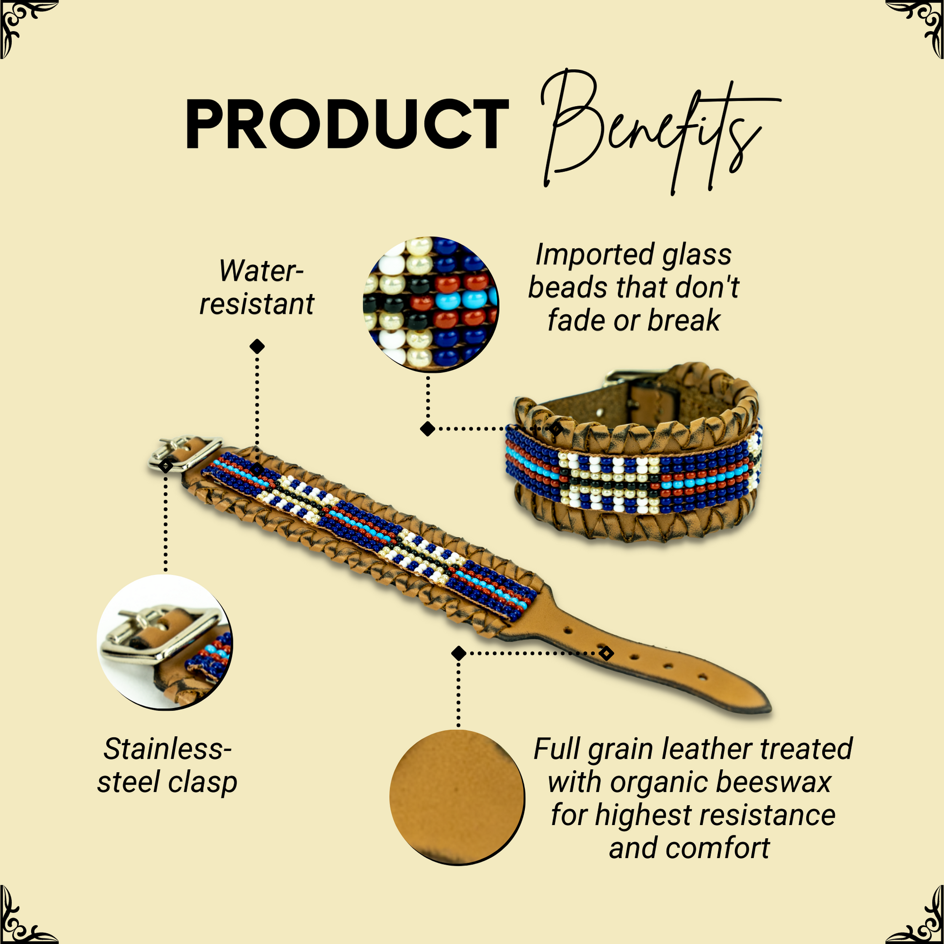 This incredible beaded bracelet from Sambboho is the perfect addition to your jewelry box. Fully handmade by female artists in Brazil. Premium leather bracelet made with world renown Slovakian glass beads. Our leather is un-dyed, full grain, and treated with organic beeswax for water resistance. Western, bohemian and native inspired designs with vibrant colors. Sustainable shopping! Your purchase allows these women to be financially independent and safe. Thank you for making a difference in their lives. This bracelet matches with the dog collar, hatband and belt from the same collection! Hypo allergenic stainless-steel closing. Flexible leather, very comfortable to wear for an extended period of time! As always, your purchase comes with a 30-days return policy and a 1-year warranty. Fast free shipping from the US.