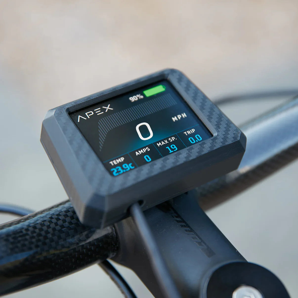 Equipped with top-of-the-line Magura™ MT7 HC3 disc brakes featuring 4-piston calipers, the Apex ensures you can stop on a dime with relentless precision and power. Combined with the regenerative braking of the Curve throttle, these brakes provide massive stopping power and control, essential for handling high speeds safely.