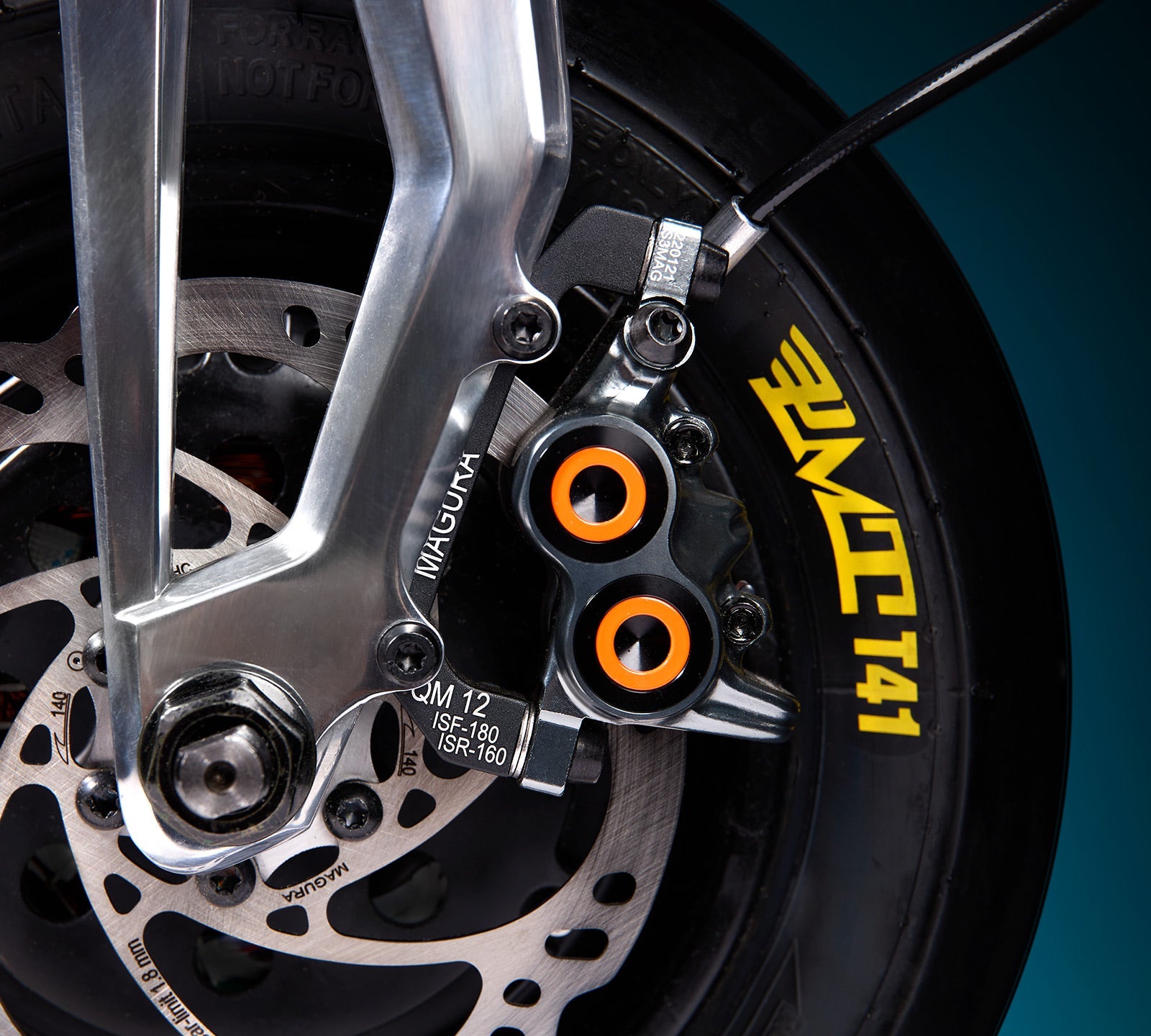 It's not just about the acceleration and ballistic speeds. The Apex also offers sublime handling, responding to your every move like an extension of your legs. Its telepathic precision and huge, stable deck provide the perfect balance of control and comfort, whether you're maneuvering through a slow, tight path or hitting top speed. The Italian-engineered 11" PMT racing slicks grip the road with unwavering tenacity, giving you the confidence to push your own limits.
