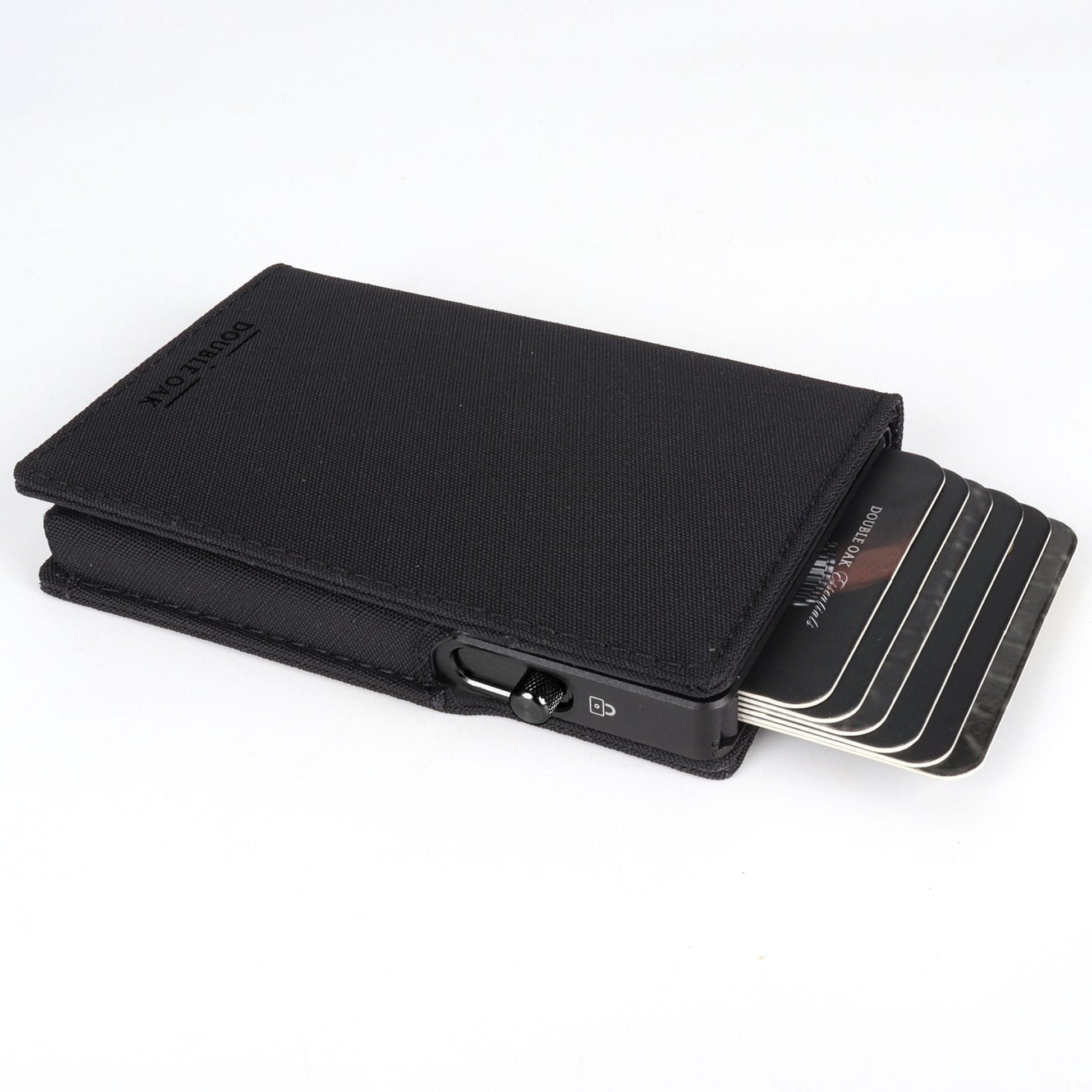 At the center is a removable aluminum card holder that carries up to seven cards in a stacked layout. The mechanism is engineered with a spring-loaded trigger for easy one-handed access. Cards are held in place by an automatic locking system that secures them until you intentionally release them — no sliding, slipping, or accidental drops, even when the wallet is shaken or turned upside down.