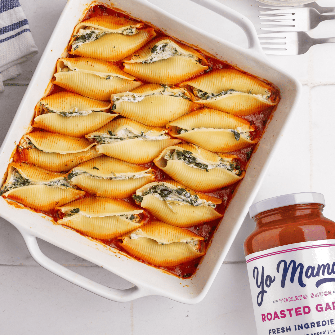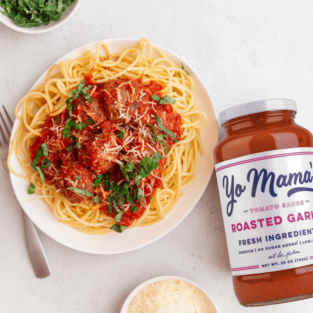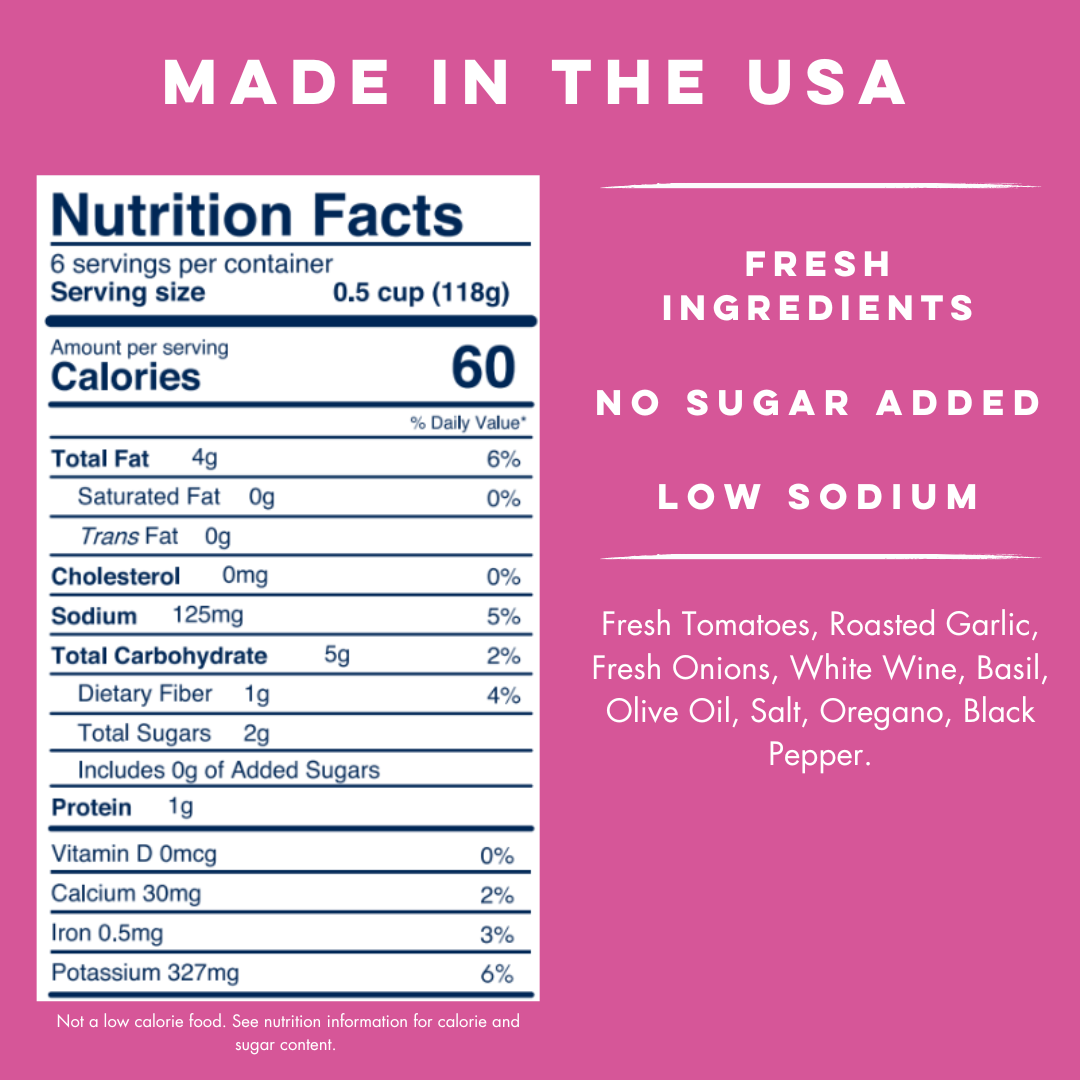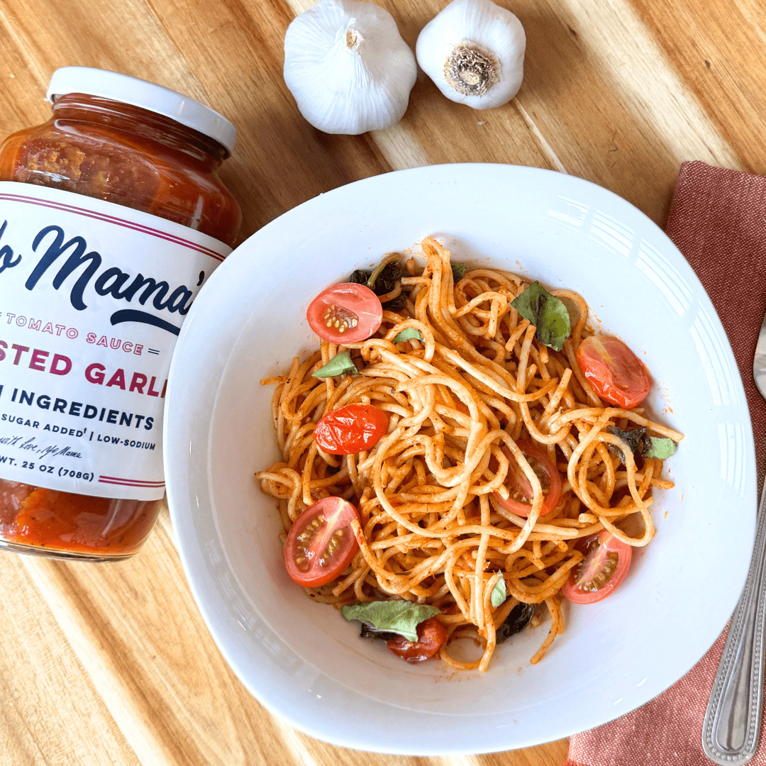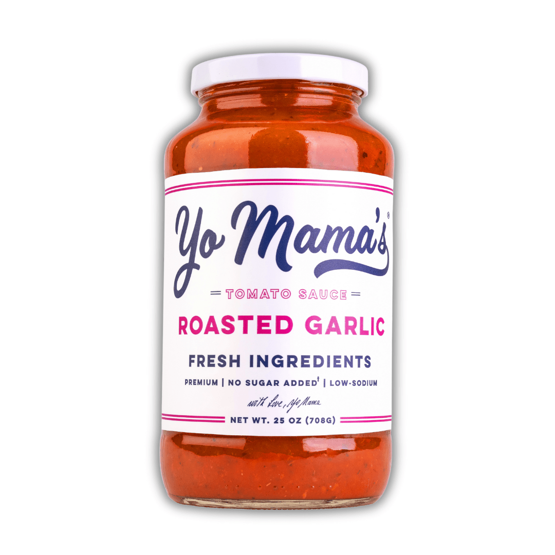 Yo Mama's Roasted Garlic is handmade with fresh tomatoes, roasted garlic, fresh onions and olive oil. Our MAMA-approved recipe is perfectly made in small batches and contains no added sugar, GMOs, preservatives or gluten.