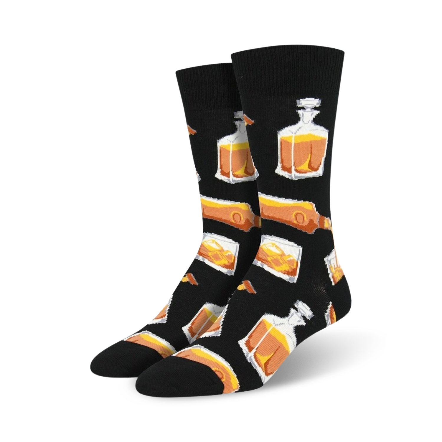 Do you love your bourbon neat or on the rocks? Some people love beer and some prefer wine. But if you love spirits made of distilled fermented grains, you will appreciate these cool men's novelty socks. Each awesome pair features decanters and glasses filled with liquid gold printed all over against a black background.