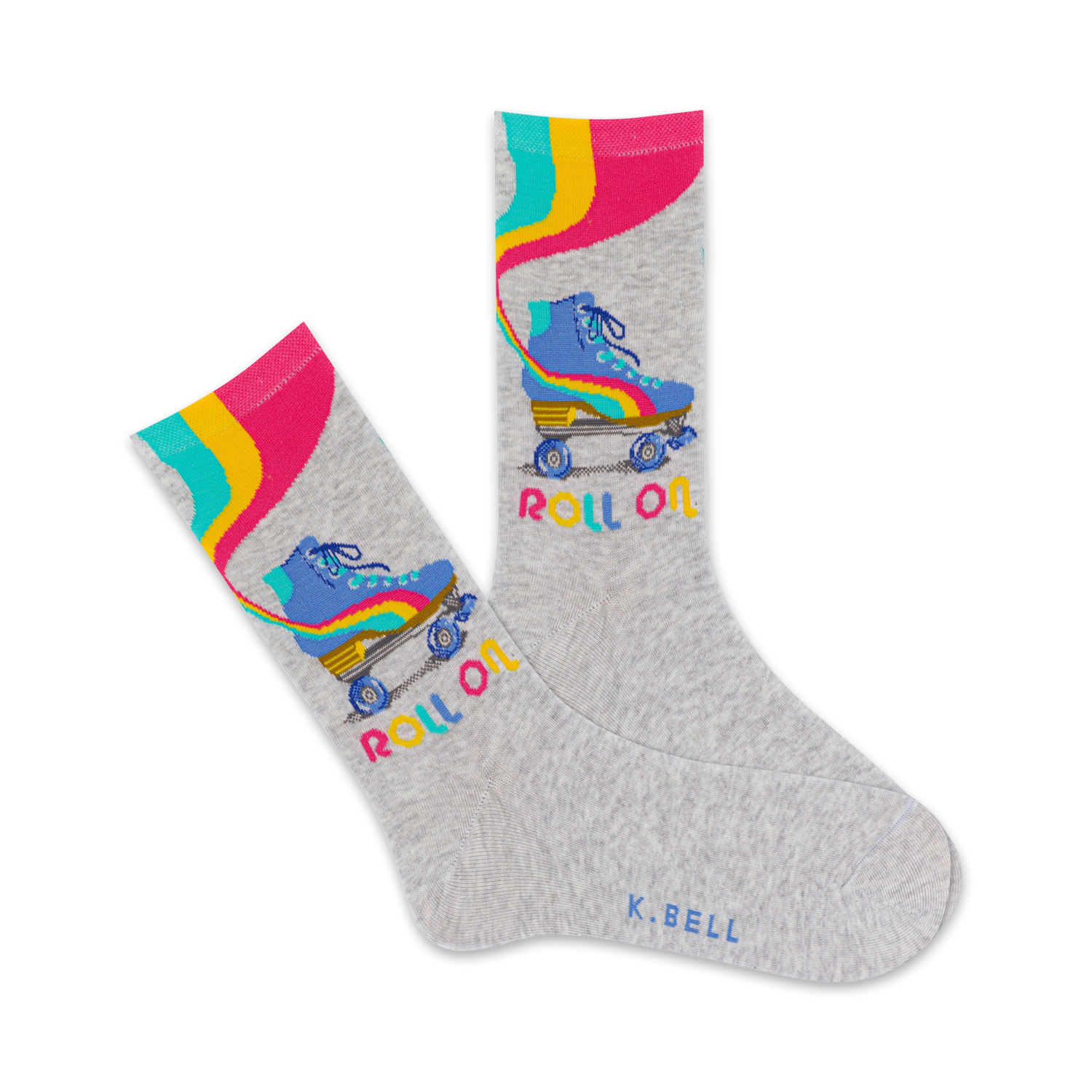 Love to roll? Then these socks are sure to get your wheels turning! Meet Roll On, the rad gray socks with a stunning showcase of retro-style blue roller skates in motion, embellished with yellow wheels and hot pink laces. With a background painted in a rainbow of colors, these socks are a vibrant tribute to the classic pastime of roller skating. Whether you're rolling on the boardwalk or just kickin' it at home, these cool socks will have you ready to jam to the beat. Available in women's crew sock size.