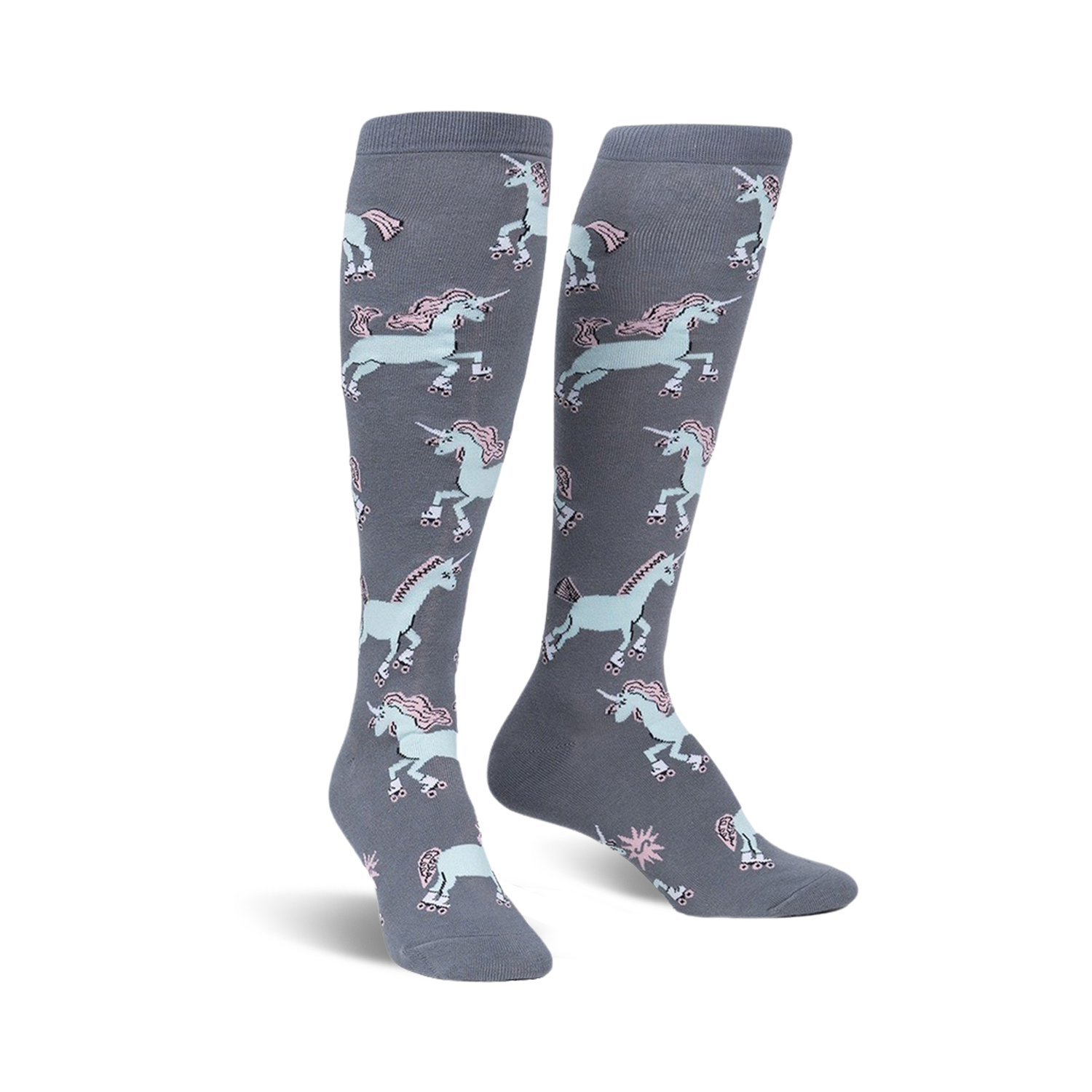 Roll wit the cuteness in these knee high socks. Each sock features adorable little unicorns gliding around in their roller skates and they are just as magical as they sound. With vibrant pink and blue patterns and as comfortable as they are fun, these women's unicorn socks will be your new favorite for any cozy night.