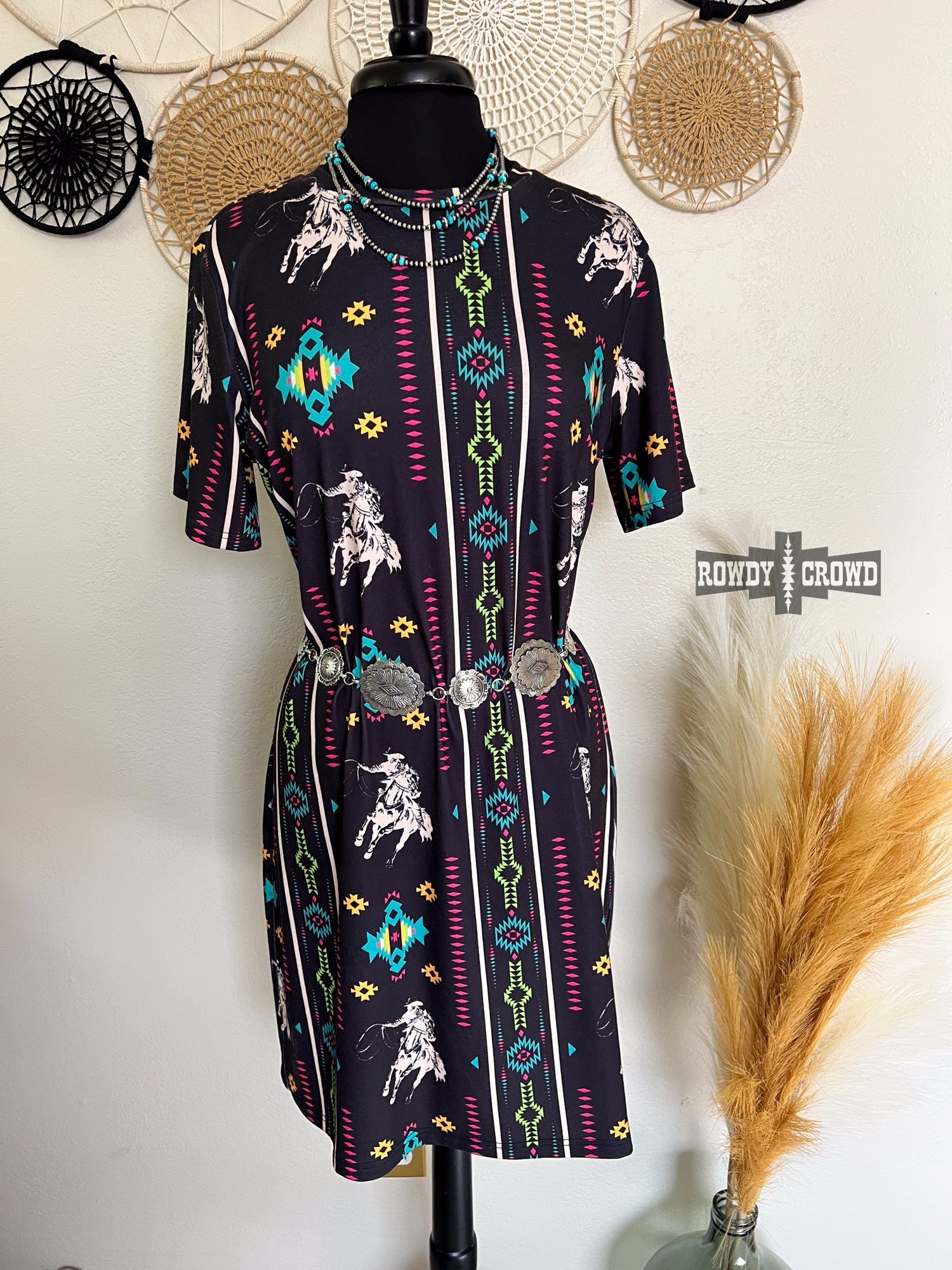 Elevate your style with our Rope & Ride Dress! The sleek and silky fabric will make you feel confident and comfortable. The perfect length and unique aztec and bronc rider print make it suitable for any occasion. Upgrade your wardrobe today!