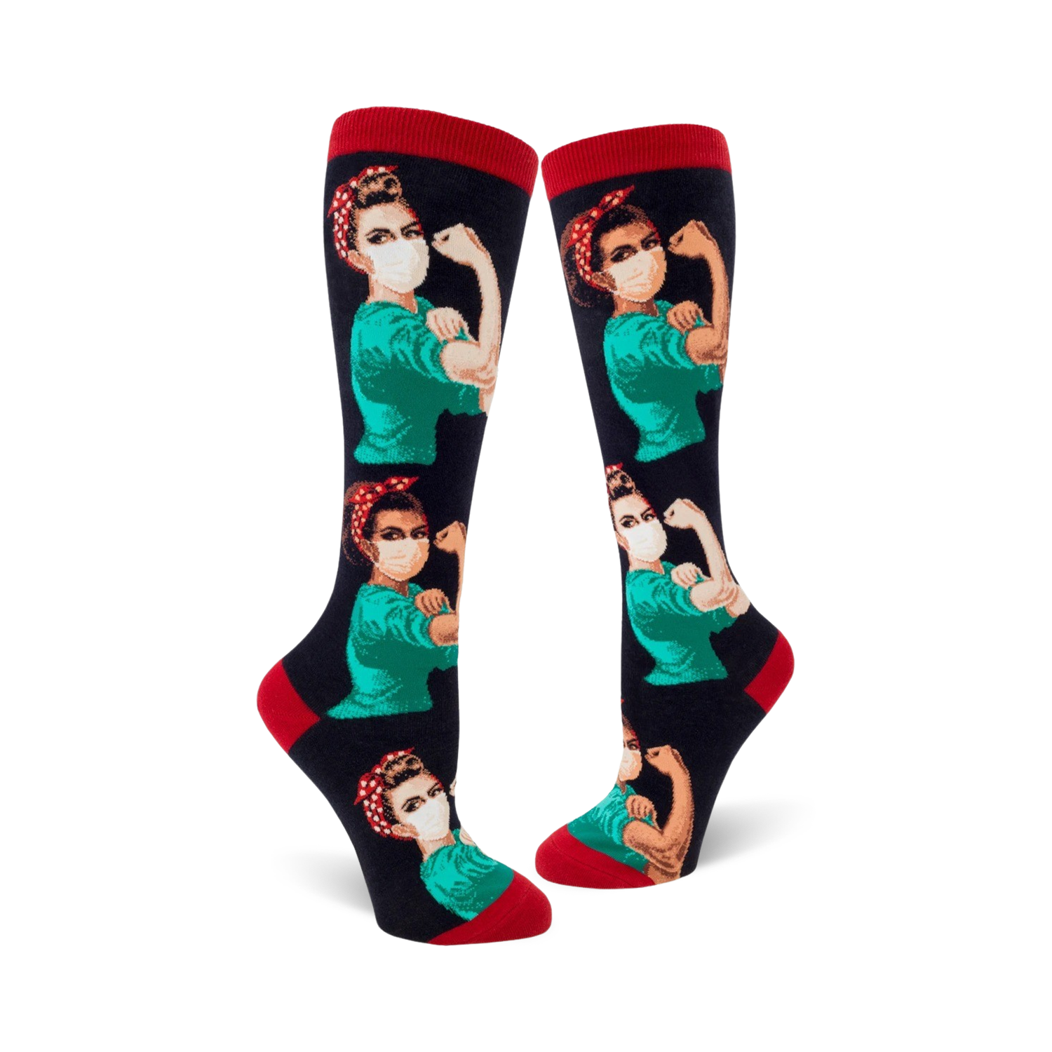 Rosie the Nurse socks pay homage to the iconic symbol of women's empowerment. From the factory floor to the front lines, these knee-high socks are a salute to all the Rosie's out there rocking red bandanas, blue polka dots, and surgical masks. Let Rosie's fierce determination inspire you every time you pull them on!