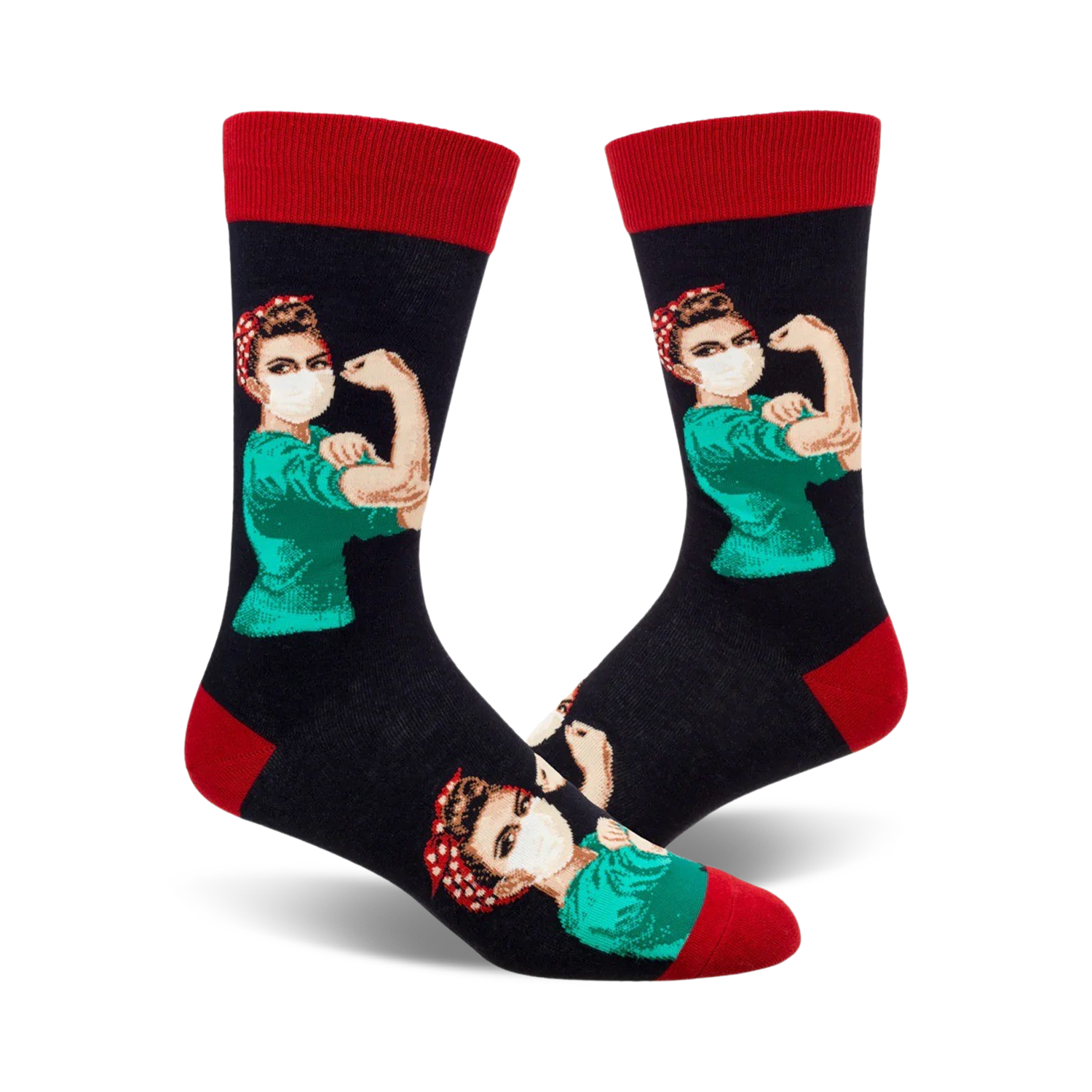 Roll up your sleeves and step into these Rosie the Nurse socks and channel your inner Rosie the Riveter! These black and red socks feature a powerful woman flexing her muscles, wearing a Rosie the Riveter bandana and a mask. Just like Rosie the Riveter helped us win World War II, nurses are working hard to keep us safe and healthy during the pandemic. So show your support for all the amazing nurses out there by rocking these socks. Plus, they're sure to make you smile every time you look down at your feet.