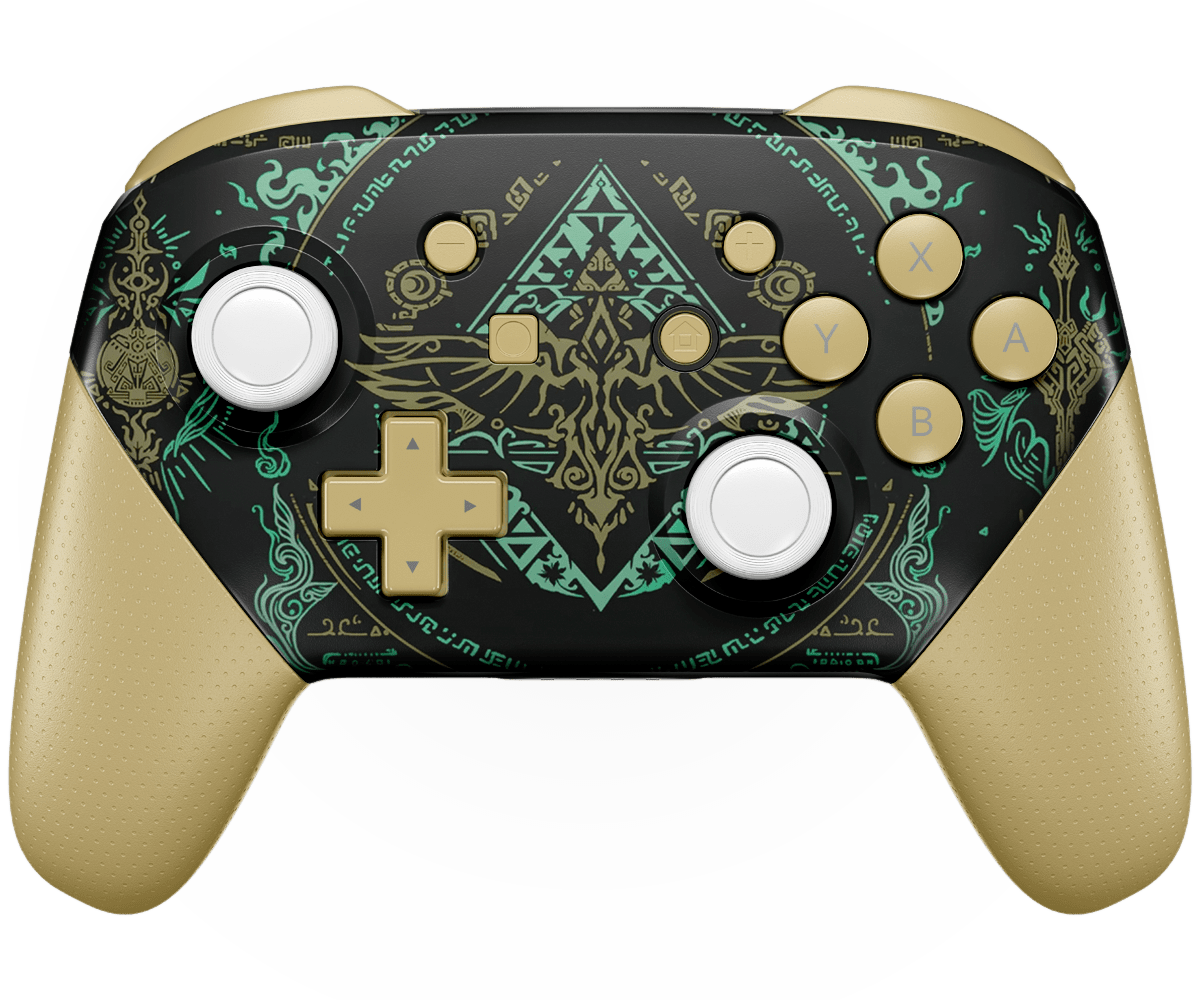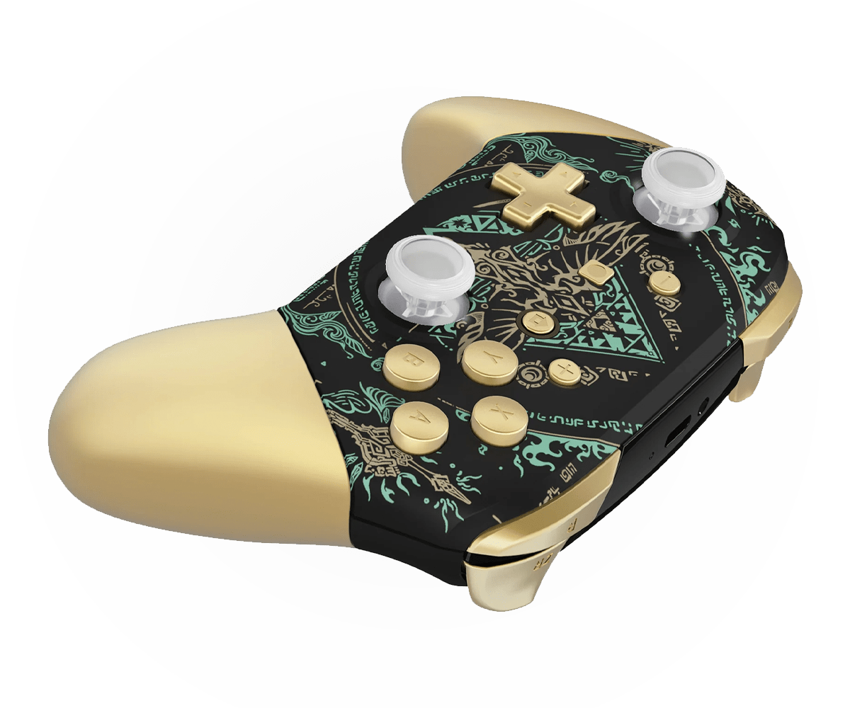 MODDEDZONE Royal Black Totem Nintendo Pro custom controller features a custom controller shell with the exclusive design, white analog sticks, a gold D-pad, four gold face buttons (A, B, X, Y), gold shoulder buttons (L and R), gold triggers (ZL and ZR), and gold siderails. It also comes with a gold Home button, and a gold Capture button for taking screenshots.