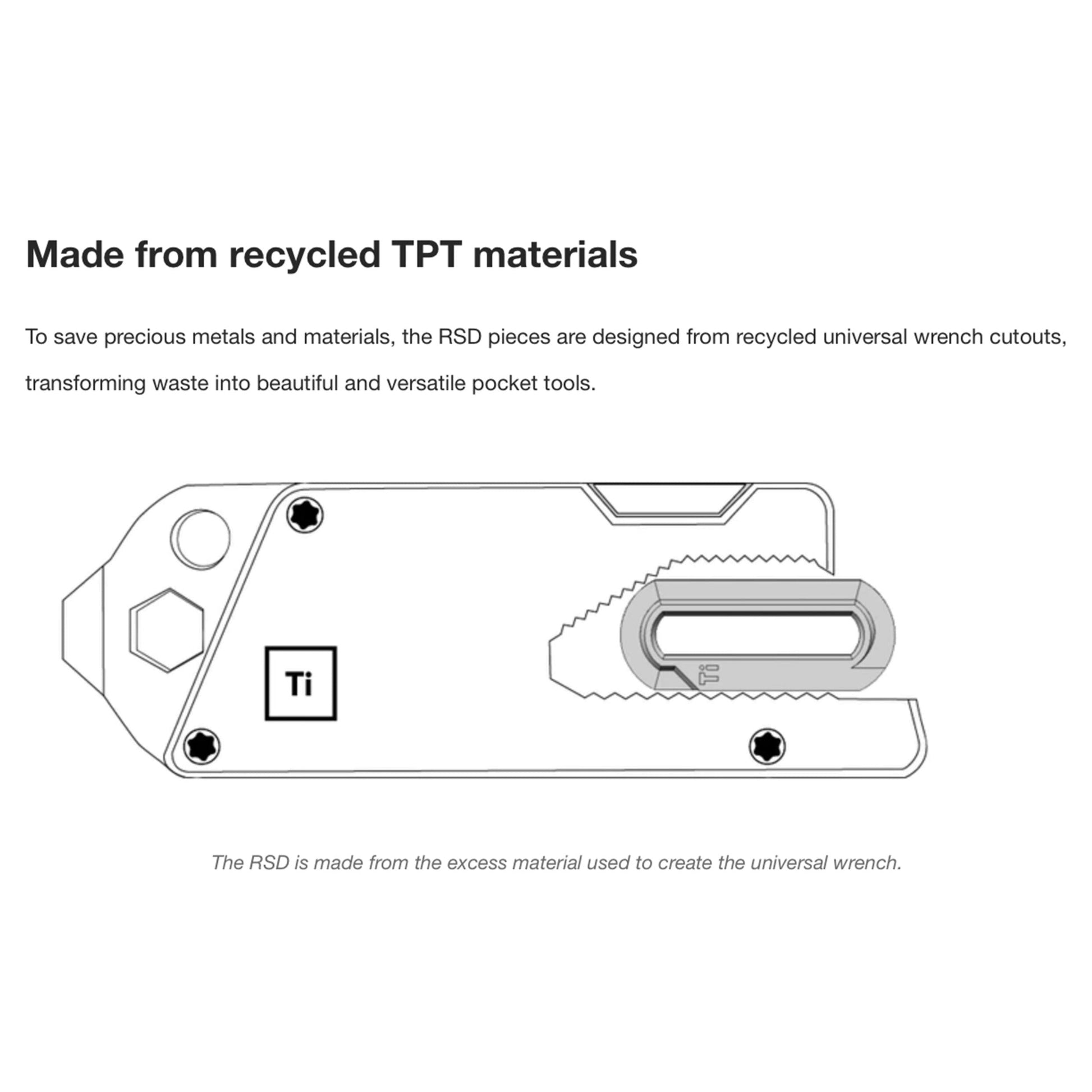 The RSD is an inconspicuous series of multiple flat head screwdrivers. An included titanium key ring helps provide torque. It ramps up from 0.03 in. to 0.078 in. (0.762 mm to 2mm)