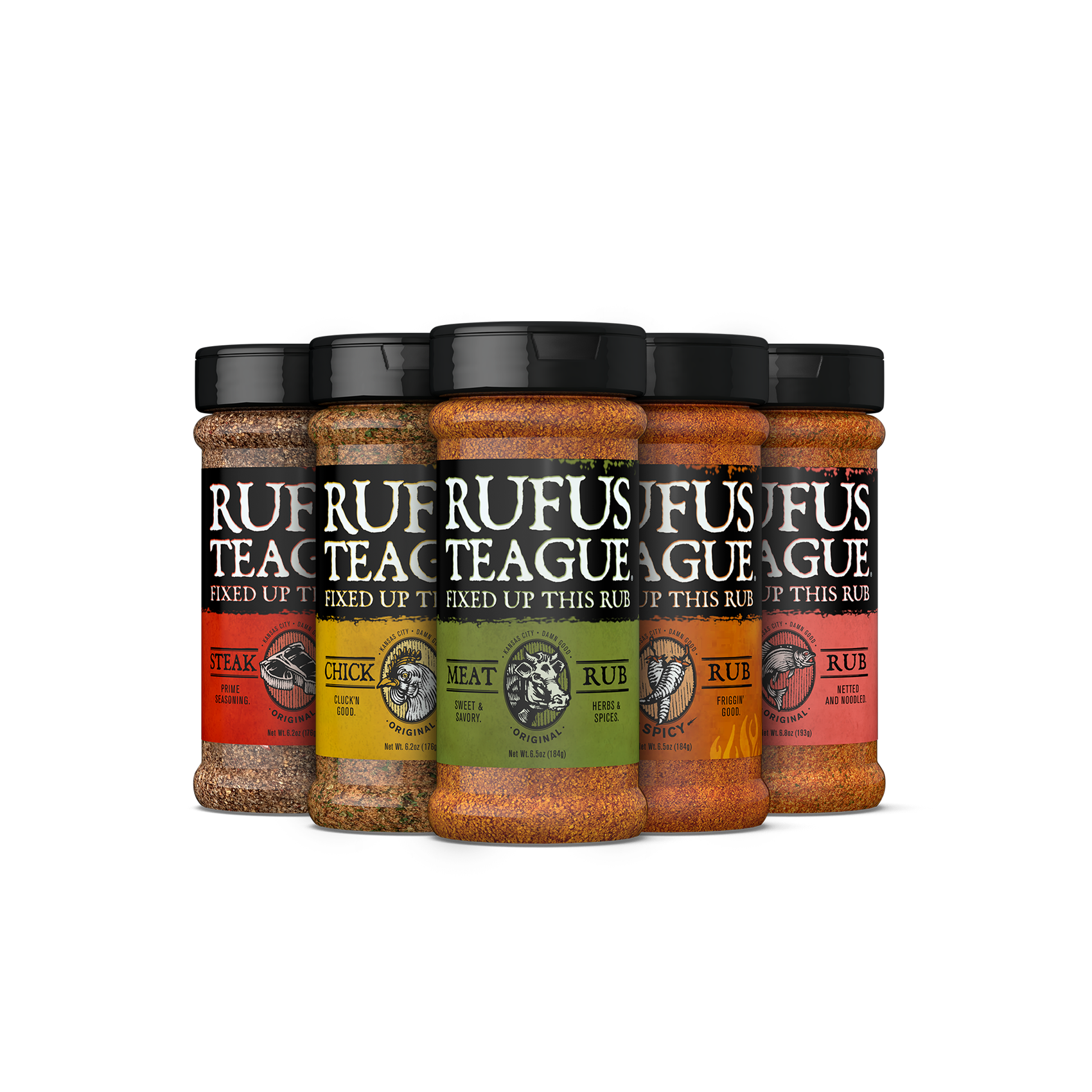 All of Rufus's spices, in one package. Meat Rub, Spicy Meat Rub, Fish Rub, Steak Rub and our new Chick N' Rub. Everything you need to make lots of food gooder... for a long time.