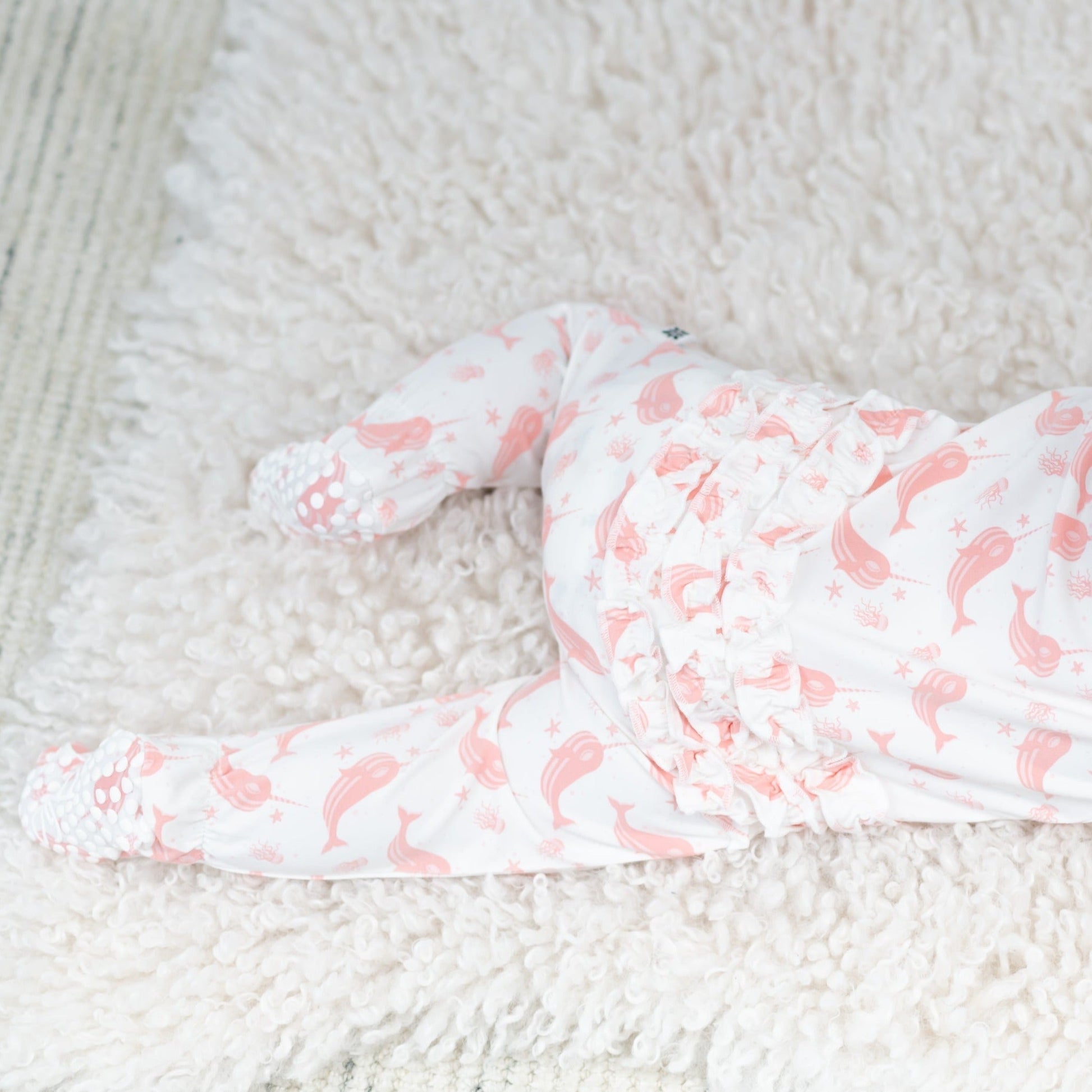 If you're a ruffle lover, this 2-way zipper footie will hit the spot! Made with our yummy, hypoallergenic, silky-smooth fabric and topped off with no-slip grips on the foot pads to ensure your little one stays stable as they grow.