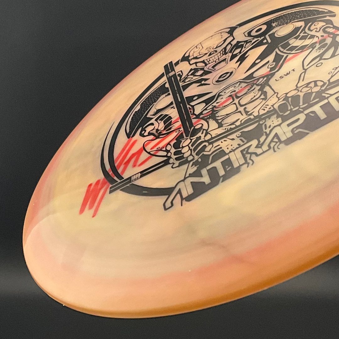 11/5/-1/2 *Scan's Stash has a freaking GEM here! This is a one of the most special discs we have ever seen! Not only is this disc INSANELY swirly, it is also stamped with a sweet "ANTIRAPTR" stamp from Les White, and then it is signed by Les! To top it off, Les then drew a custom art piece on the underside of this epic disc!