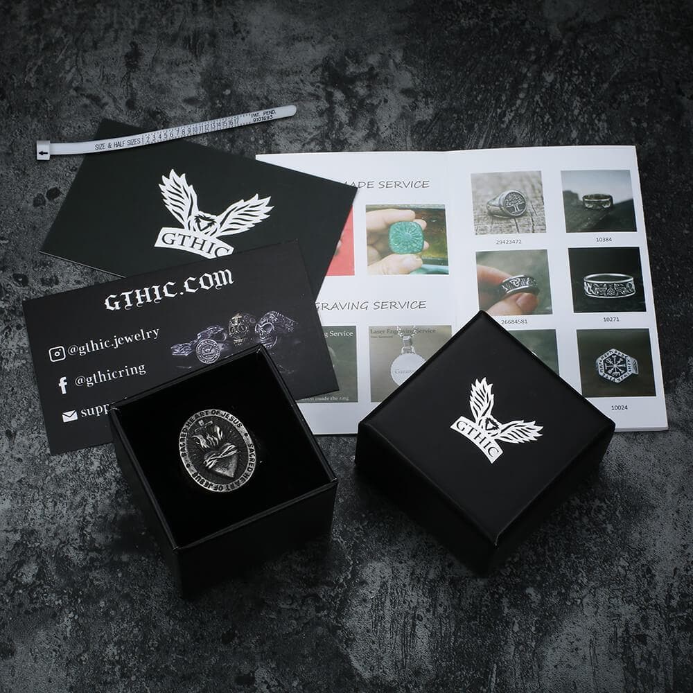 The Sacred Heart is often depicted in Christian art as a flaming heart shining with divine light, pierced by the lance-wound, encircled by the crown of thorns, surmounted by a cross, and bleeding. The wounds and crown of thorns allude to the manner of Jesus' death, while the fire represents the transformative power of divine love. The heart of Jesus is viewed as a symbol of "God's boundless and passionate love for mankind". Great styled ring. The whole ring is exquisite in workmanship and delicate in carving. Get yours today!