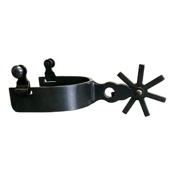 A black steel Mexican style spur. 1" wide band with 2 1/4" seven point black rowels. The rowels can be locked for more direct contact.