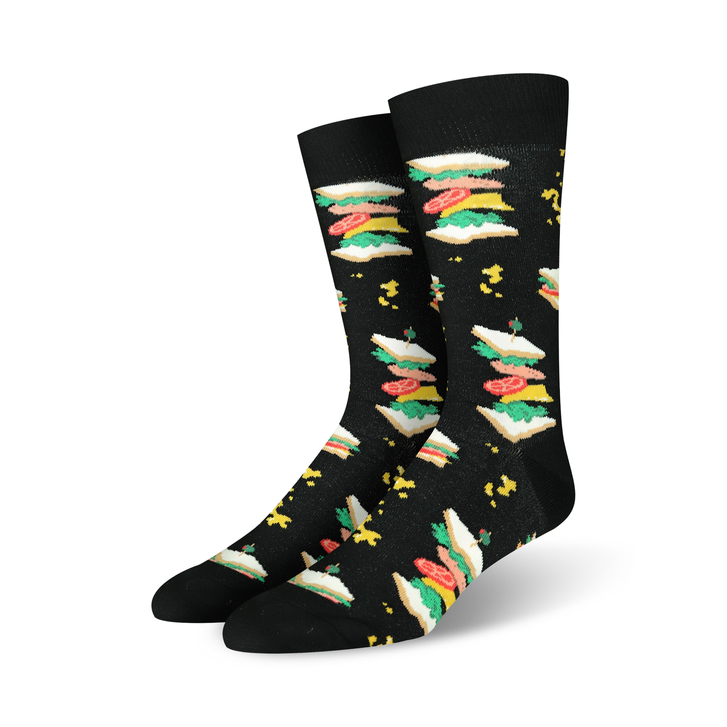 Hot. Cold. Open-faced. Pocket. Hero. The options are endless! If you love all types of sandwiches, then you will love these cool men's novelty crew socks. Each cool pair features sandwiches with all the trimmings printed all over against a black background. Feed your feet with a pair of these delicious feet warmers!