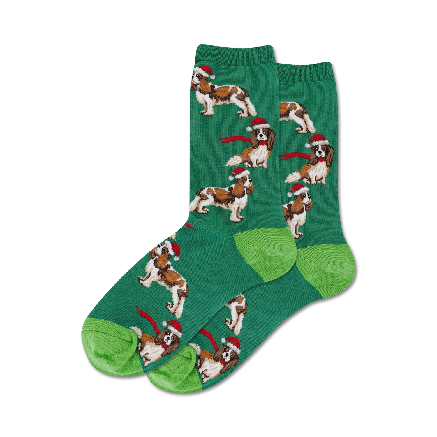 Add some Christmas cheer to your feet with our Santa Dog Crew Socks! These festive socks feature adorable Cavalier King Charles Spaniels dressed as Santa Claus. These pups are ready to spread holiday cheer with their jolly red hats and scarves. They're perfect for spreading holiday cheer or just adding some fun to your everyday look.