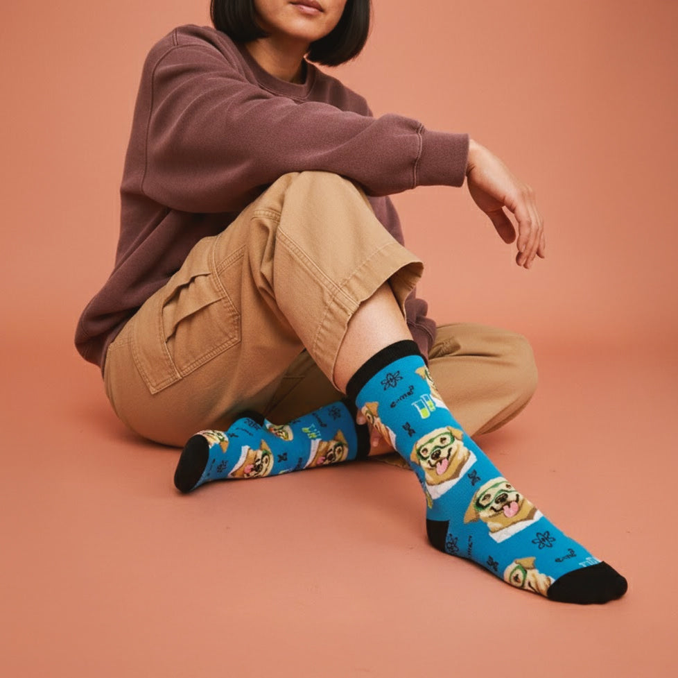 Do you love science? Do you love cute labradors? If that's the case. these awesome women's novelty crew socks belong in your sock drawer! Each fun pair showcases friendly-looking labs wearing a white coat and goggles, filled flasks, and scientific formulas printed all over against a blue background.