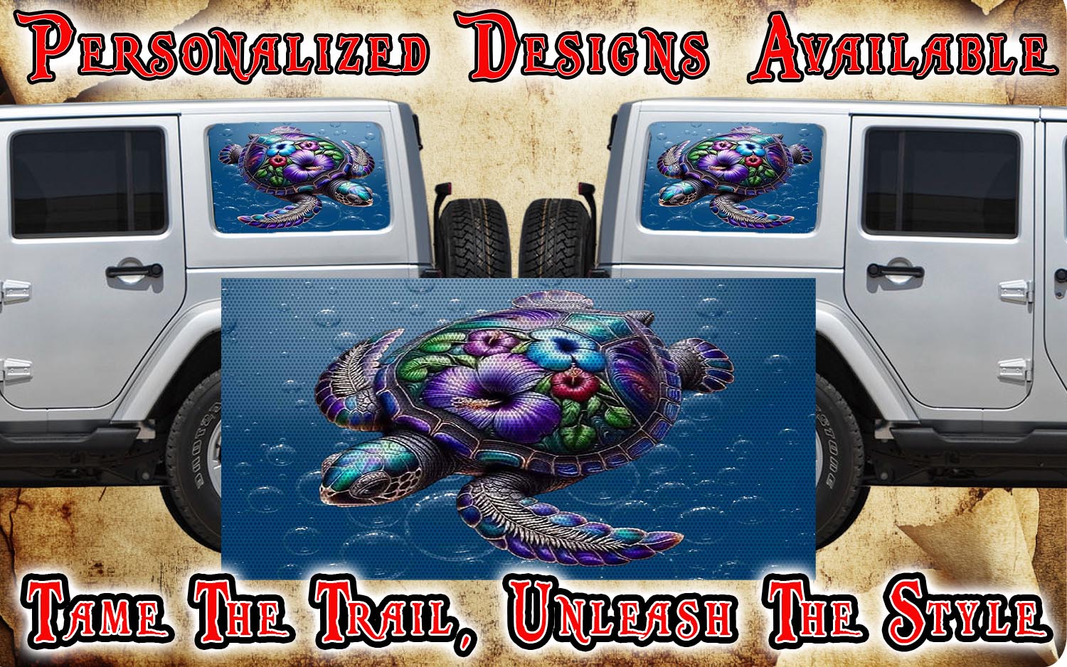 Add a splash of ocean charm to your ride with this playful Sea Turtle rear quarter window see-through graphic. Designed to let light in while showcasing a graceful sea turtle, it’s the perfect way to express your love for marine life without blocking your view. Easy to apply and durable, this graphic brings a fun, beachy vibe wherever you go.