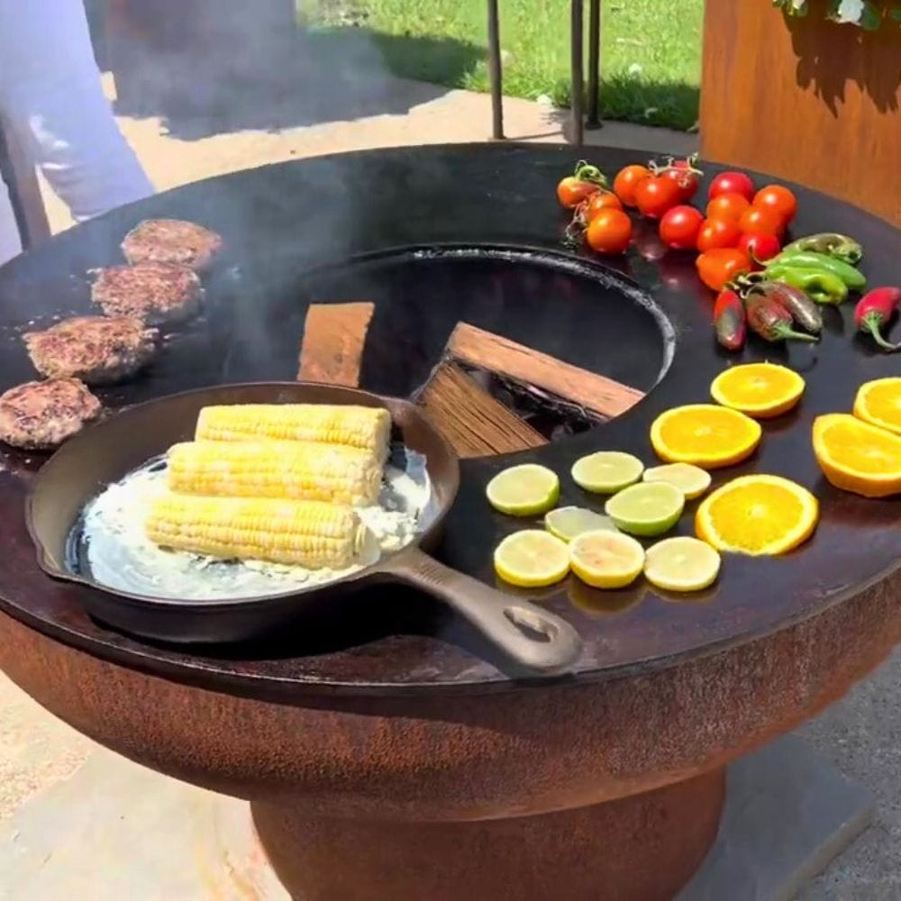 Stunning, but also a wonderful space saver. Take off the cooktop, and voila! You can relax in the warmth of a fire pit. Add an optional grill grate insert to cook right above the charcoal or wood-burning fire for a smokey flavor.