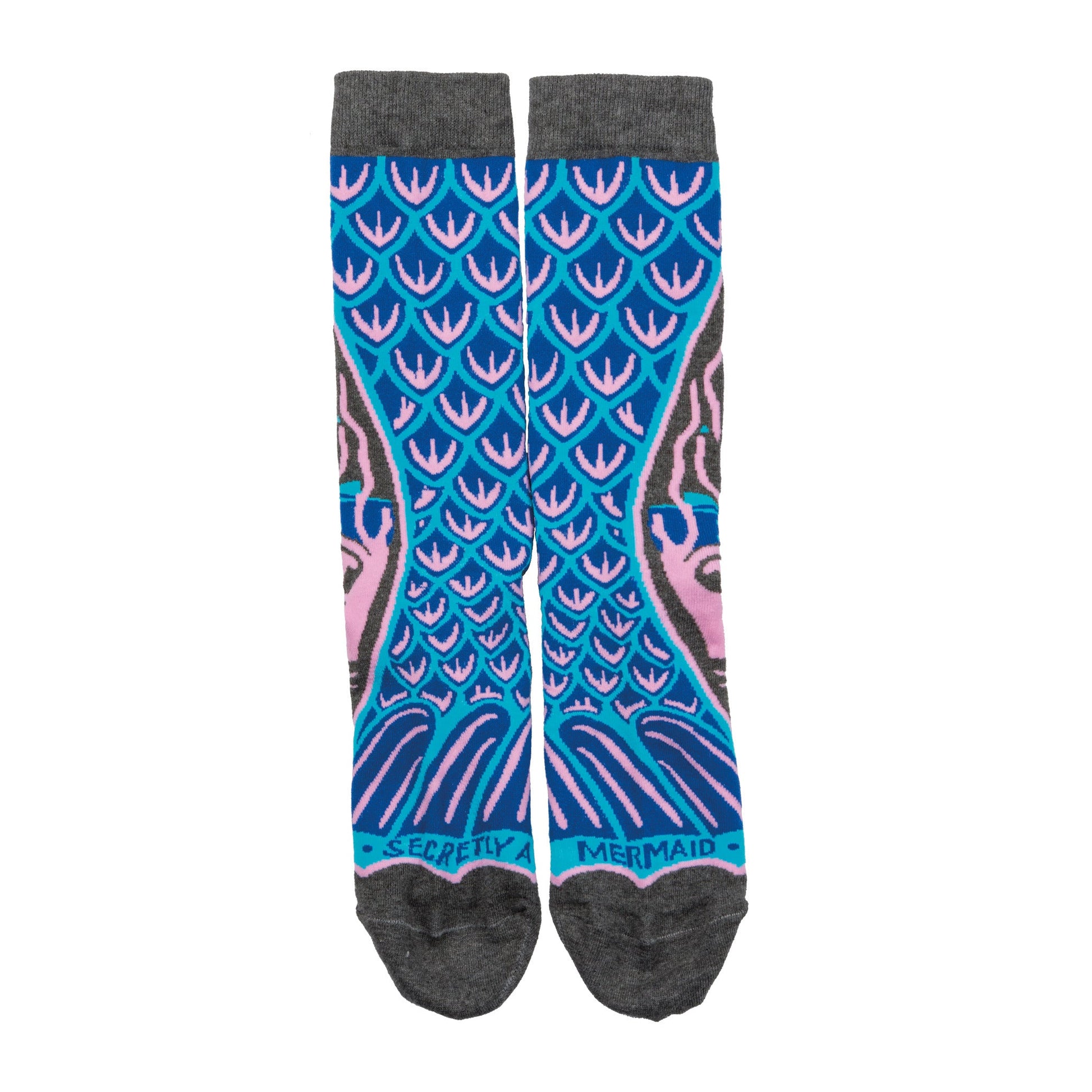 These 'Secretly Mermaid' socks are pretty fun. The main part shown is a teal and pink mermaid tail design- it's a scale pattern with a stylized mermaid-like figure visible at the bottom. The socks themselves have a dark grey cuff. They're crew socks, and the words 'Secretly a Mermaid' are printed subtly near the bottom.