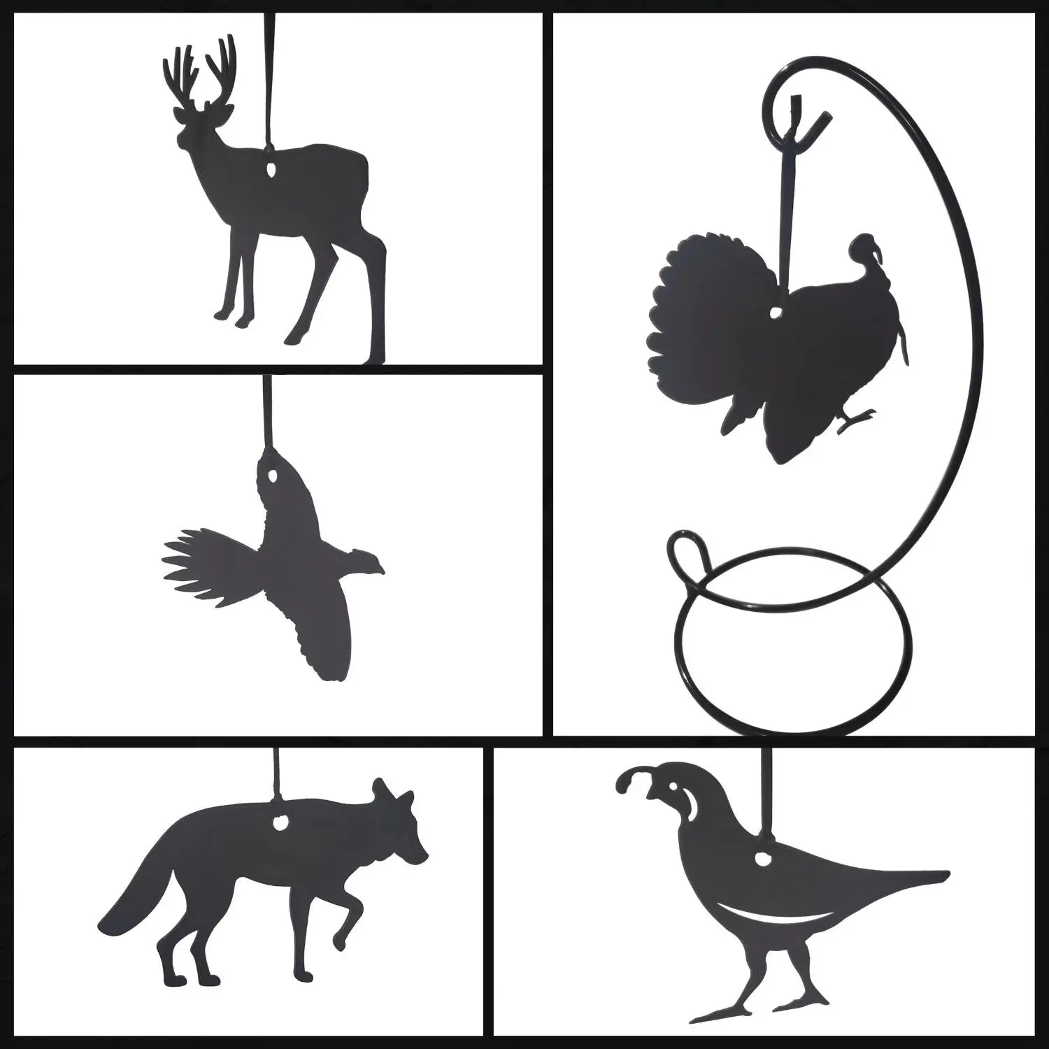 Creative and unique! Our wildlife animal series of Christmas tree ornaments includes this set of 5 silhouettes: a beautiful buck, quail, flying pheasant, turkey, and coyote.