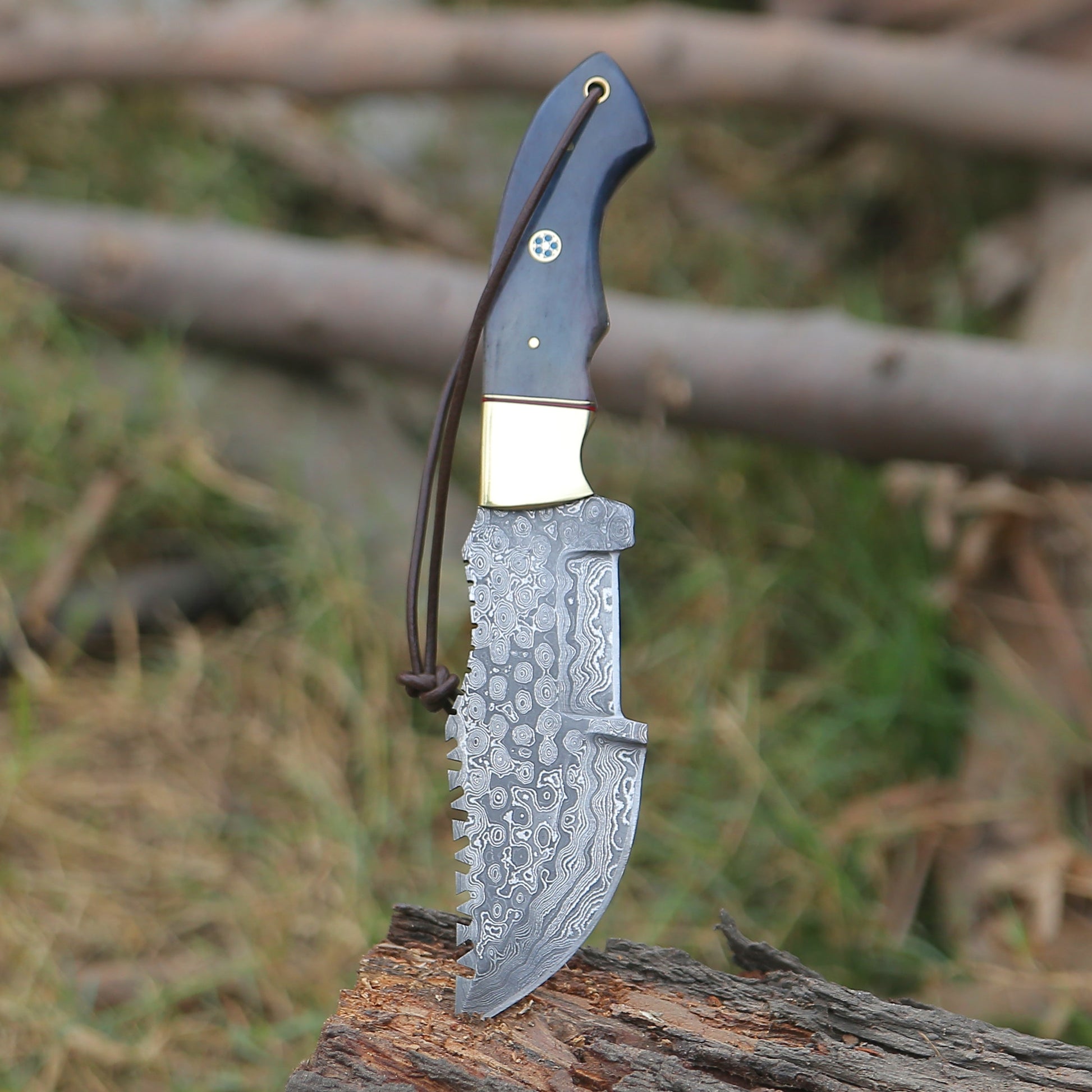 DAMASCUS HUNTING KNIFE, DAMASCUS STEEL TRACKER BLADE, EXOTIC BONE HANDLE, FIXED BLADE, INCLUDES HAND STITCHED SHEATH