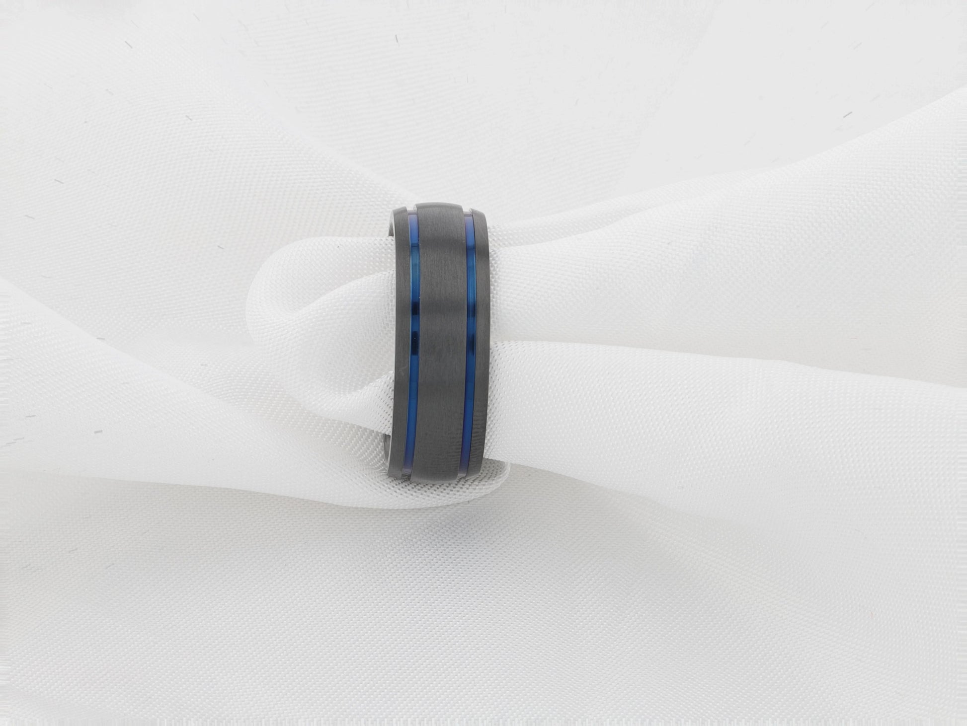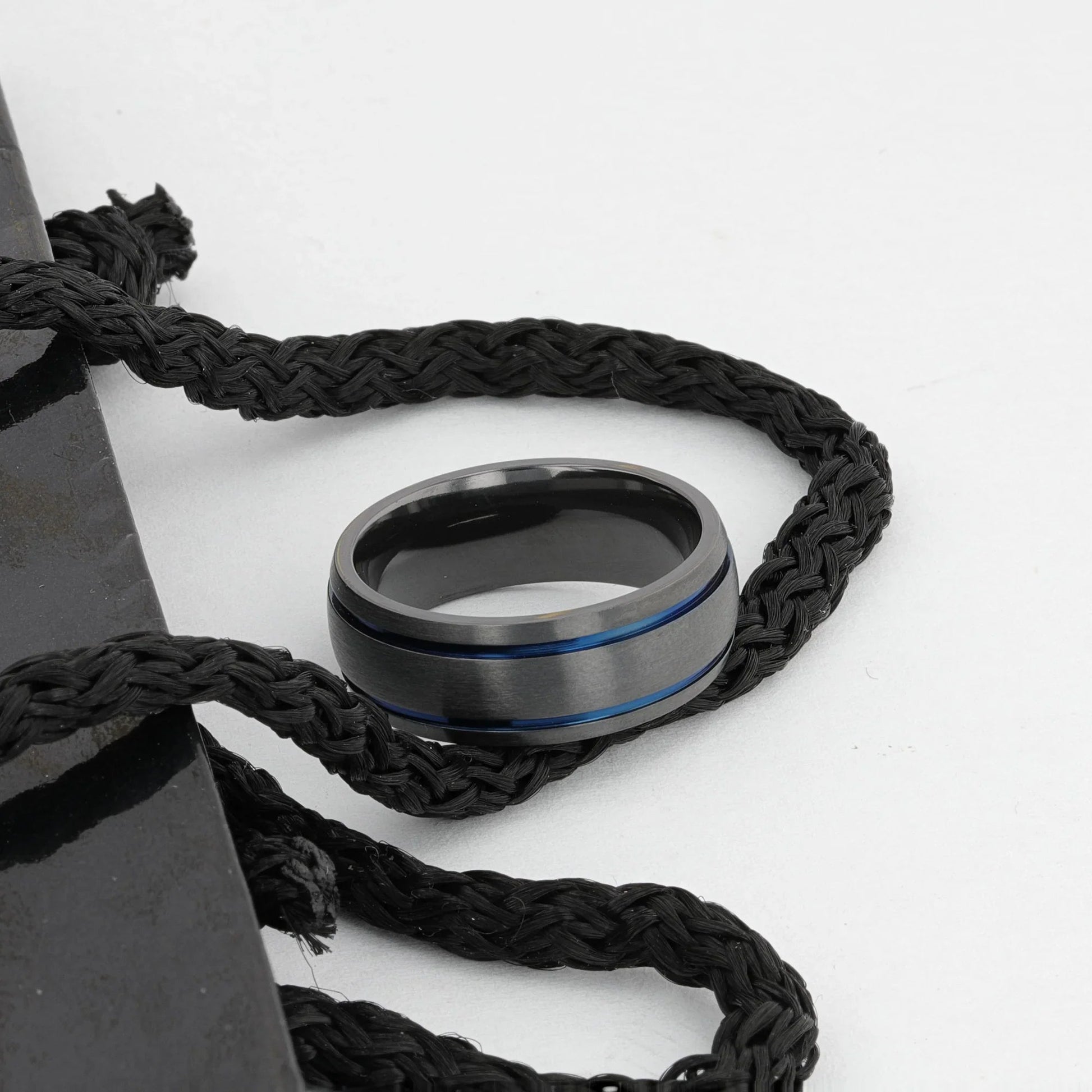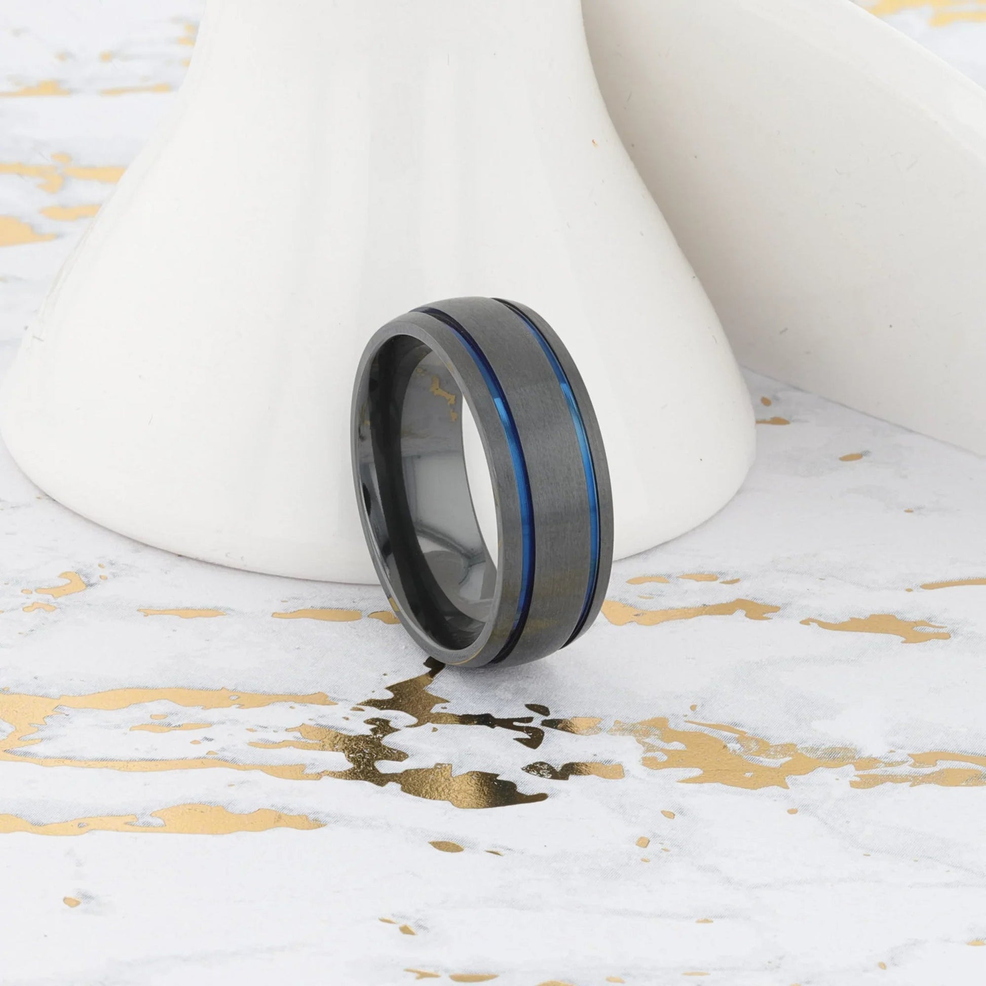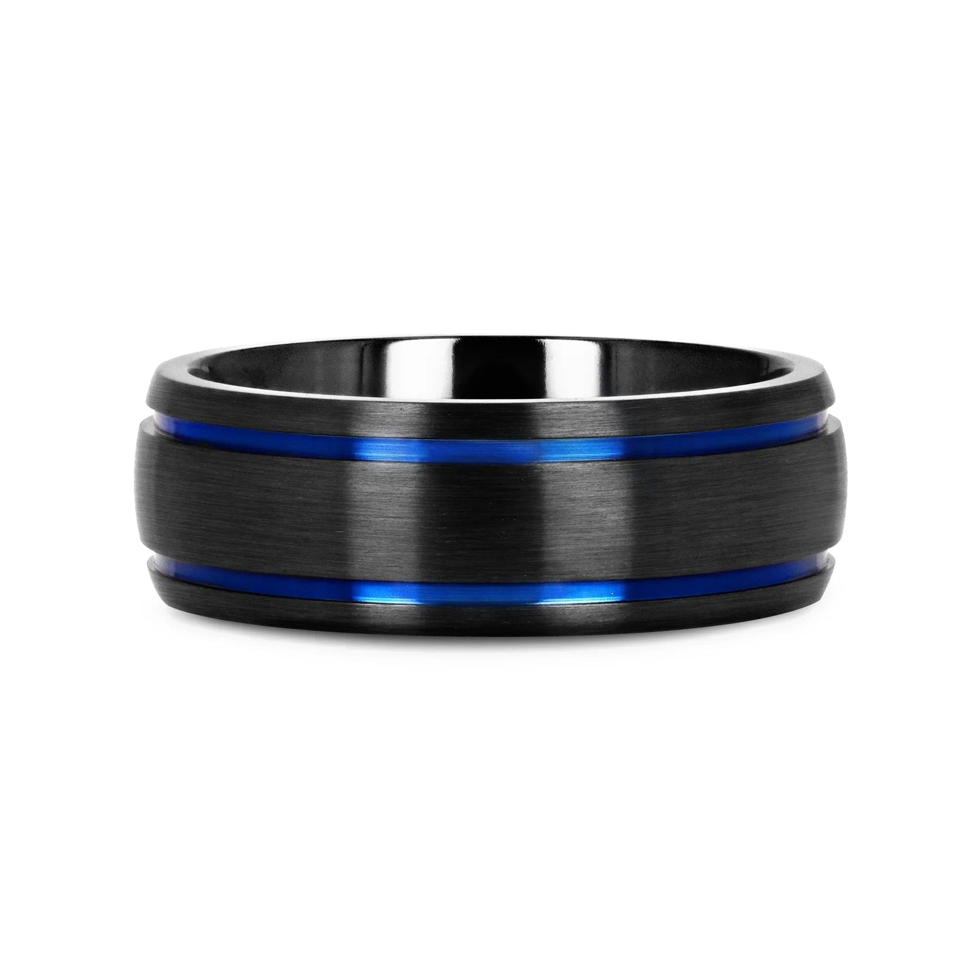 SHERIFF Domed Black Titanium Brushed Finish Men’s Wedding Ring with Blue Grooves – 8mm