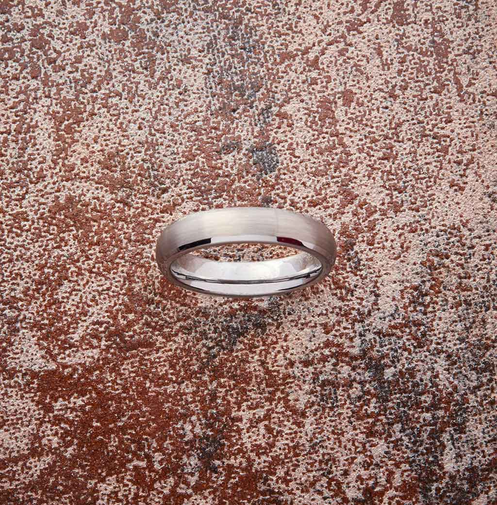 The process of creating the EMBR silver tungsten band begins with taking a high-strength tungsten powder that’s combined with carbon to achieve its amazing strength. Each ring is then compression molded, sintered and polished, resulting in a remarkably smooth surface and an exquisite shine.