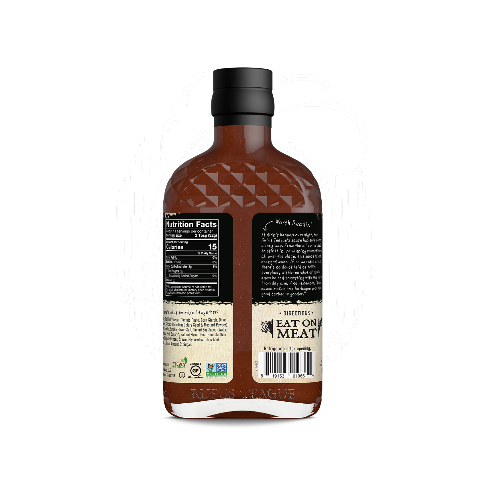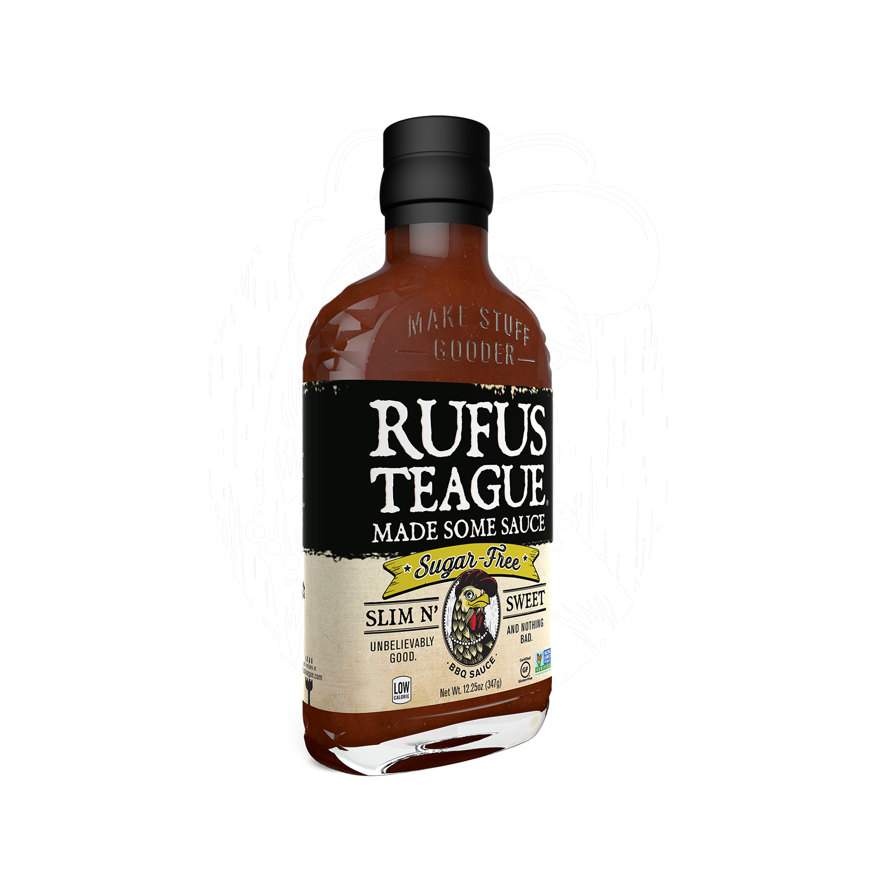 As with all Rufus Teague sauces Slim N’ Sweet is made with the finest natural ingredients. Sweetened with health-minded, all-natural Stevia and no sucralose or other artificial sweeteners. So, make your food happy and remember, “Good sauce makes bad barbecue good and good barbecue gooder.”