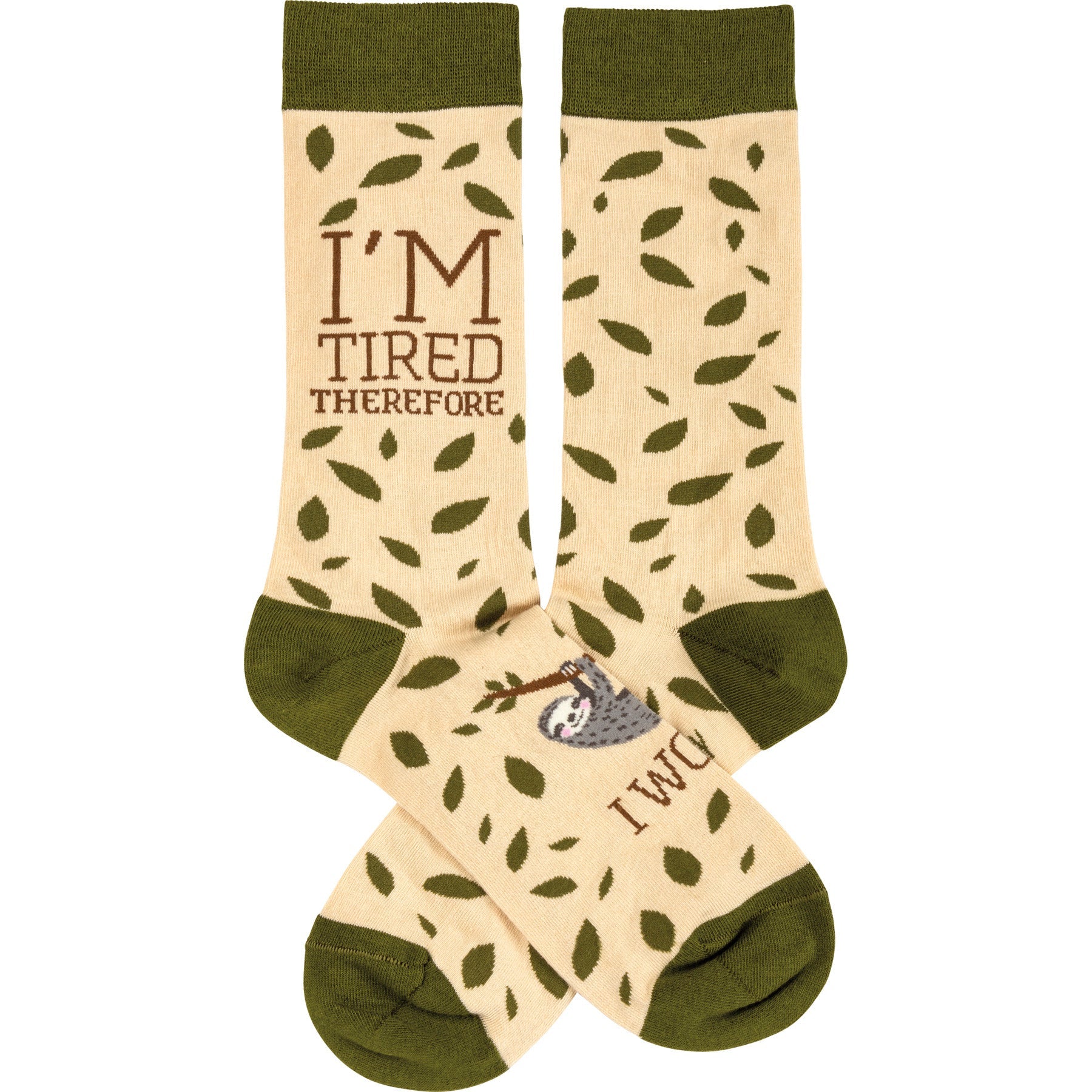 These 'Sloth I'm Tired' socks are beige with a scattered pattern of small, olive-green leaves. The visible portion shows the words 'I'M TIRED THEREFORE I WILL' printed vertically on one sock, with a small sloth illustration hanging upside down from a branch near the bottom. The socks have olive-green cuffs. They're comfy, and honestly, relatable.
