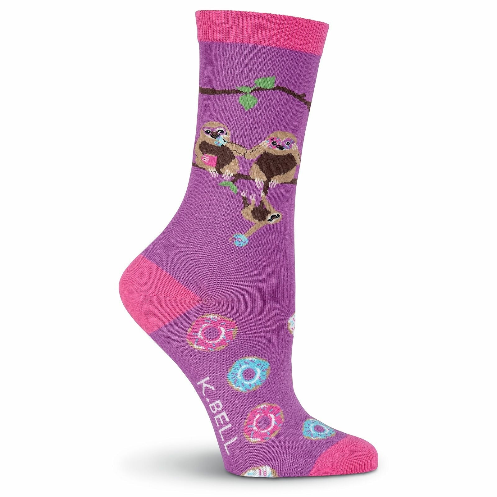 Slow down your day in style. Have a sweet treat to start your lazy Sunday morning! These silly socks are sure to please any donut and sloth lovin' person. Each cool pair of pink and purple crew socks features an adorable family of sloths hanging out and enjoying some super tasty donuts.