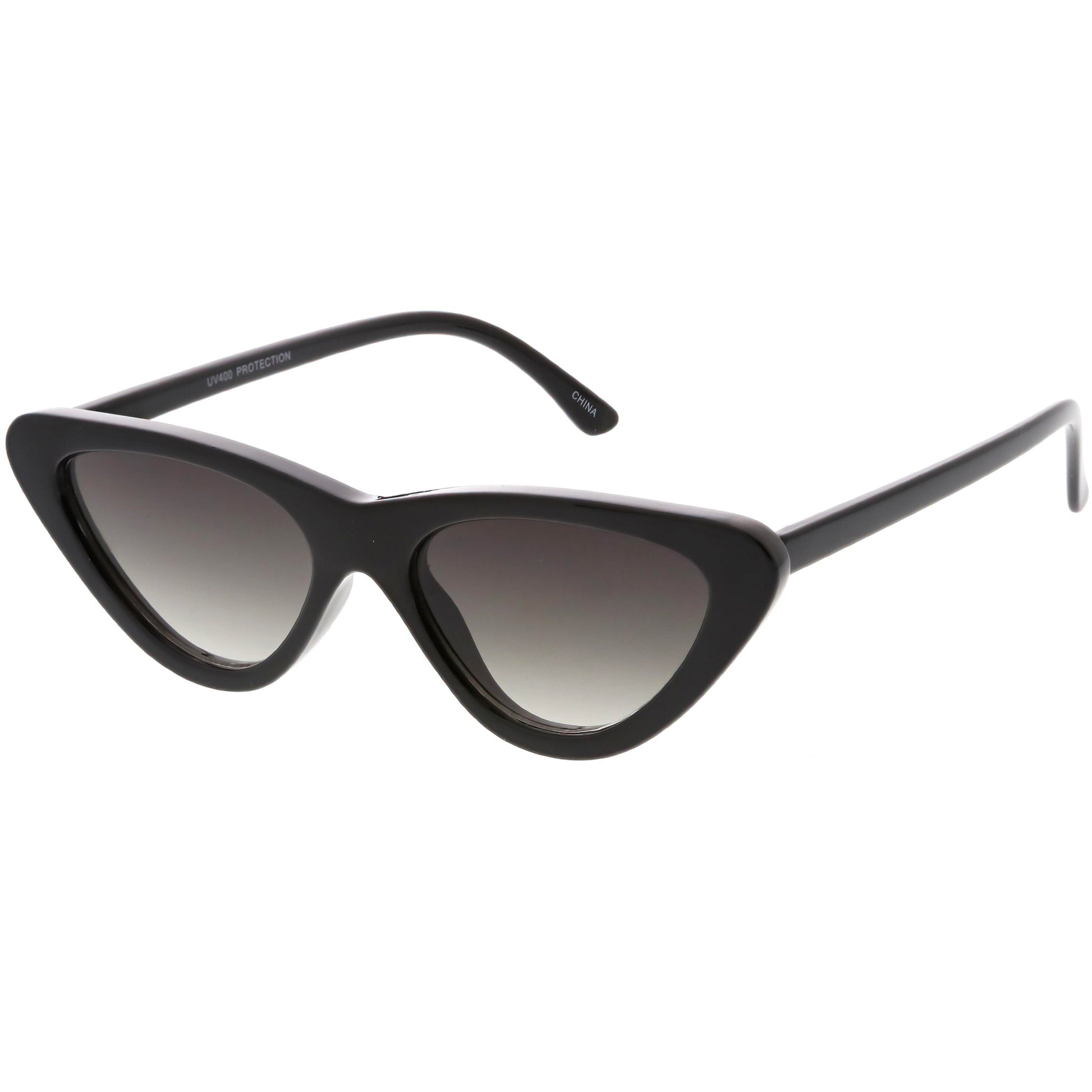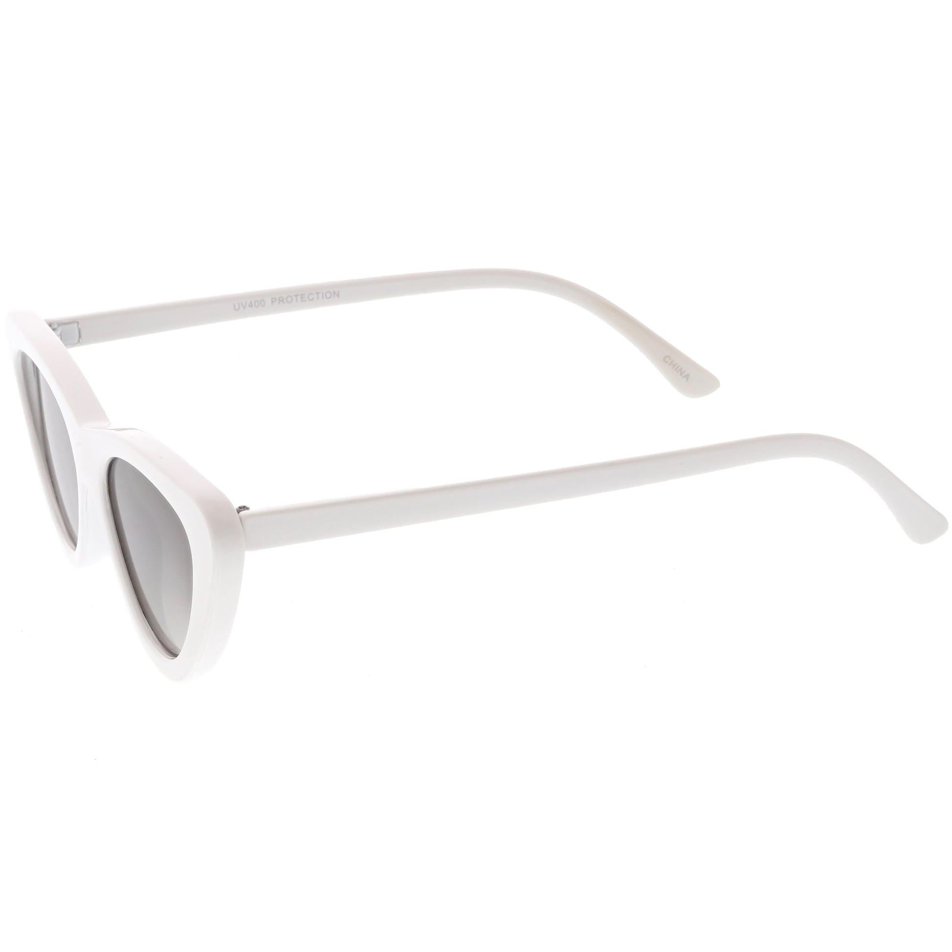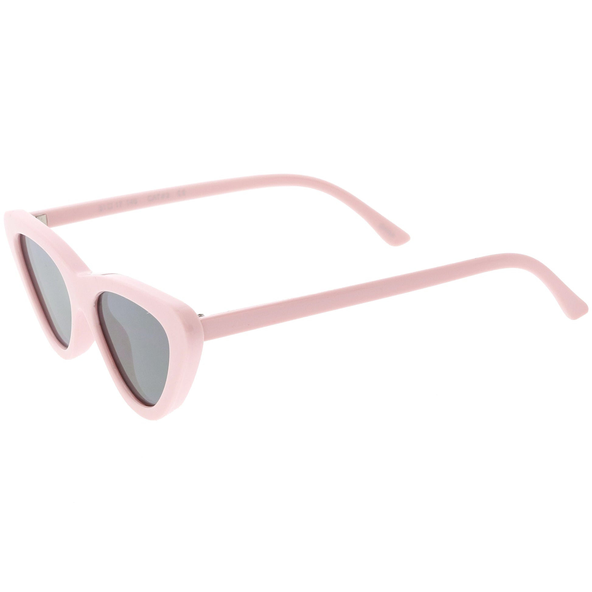 - Featuring a sleek and flirty vintage 90s inspired design, these cat eye sunglasses feature a thick frame with neutral colored flat lenses. Finished with an exaggerated shape with rounded edges and high sitting arms, these edgy sunglasses are a total must-have. Made with a plastic based frame, reinforced metal hinges, and 100% UV protected lenses.