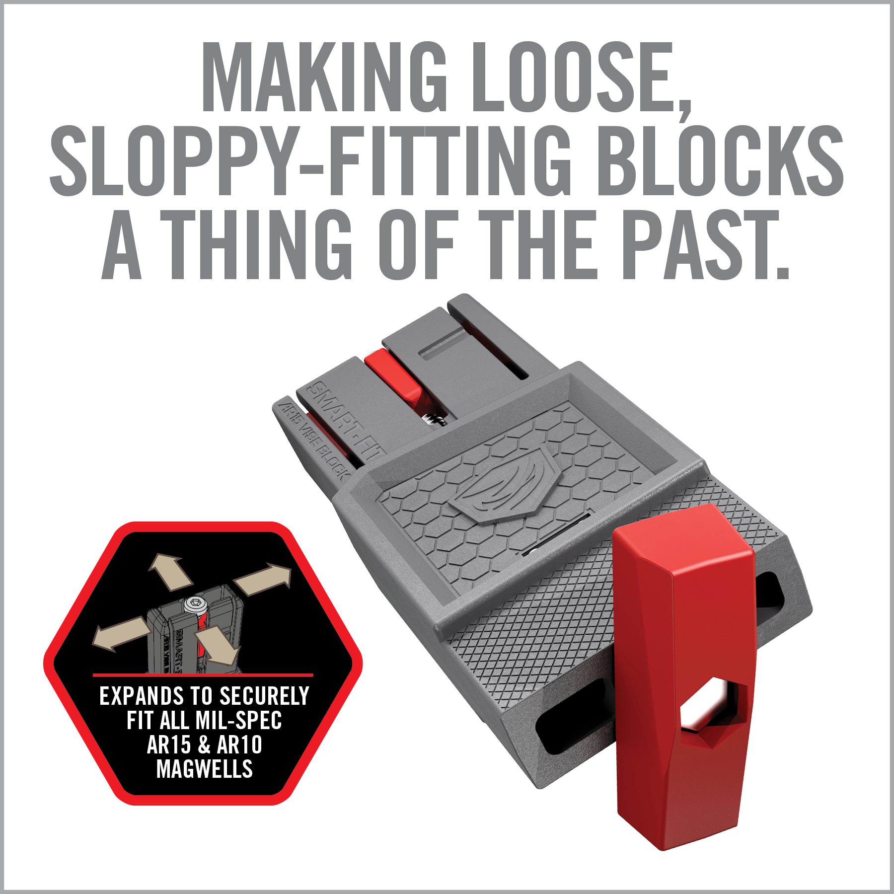 The Smart-Fit AR15 Vise Block and Vise Block Sleeve for AR10, DPMS LR-308 and SR-25 is the best lower receiver vise block you’ll ever use. Magwell sizes have a notoriously wide range of tolerances, and traditional blocks create wiggle and wobble on a gun vise. Smart-Fit’s design solves that. It expands to fit all MIL-SPEC AR15s, AR10s and similar magwells, making loose, sloppy-fitting blocks a thing of the past.