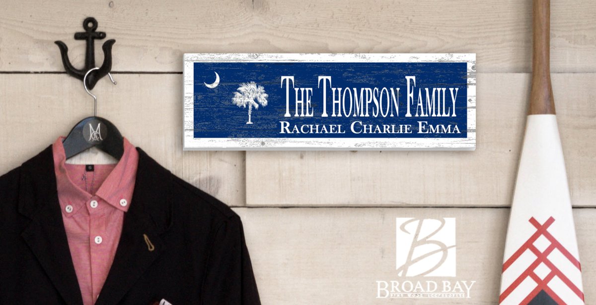 This unique Broad Bay farmhouse-style decor, personalized South Carolina State Flag sign makes a great wedding gift, mancave decoration, housewarming present, or family gift idea for any occasion. Broad Bay only uses solid wood for the highest quality South Carolina flag home decor signs. Created daily in Virginia Beach, our South Carolina signs feature our unique Fresco Print process that actually embeds your design into the surface of the solid wood sign for a long lasting and vibrant appearance. Personalized fast, our customized South Carolina signs make the perfect gift for a man, woman or couple!