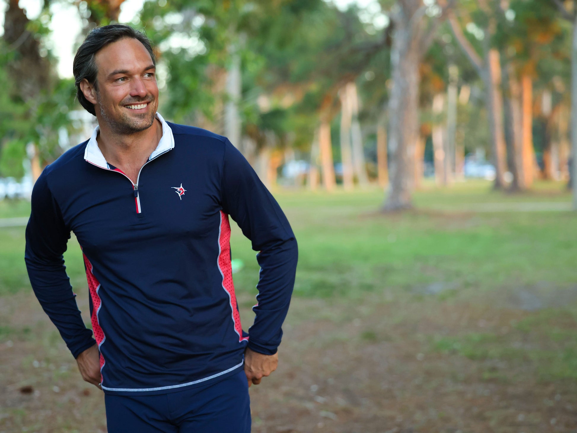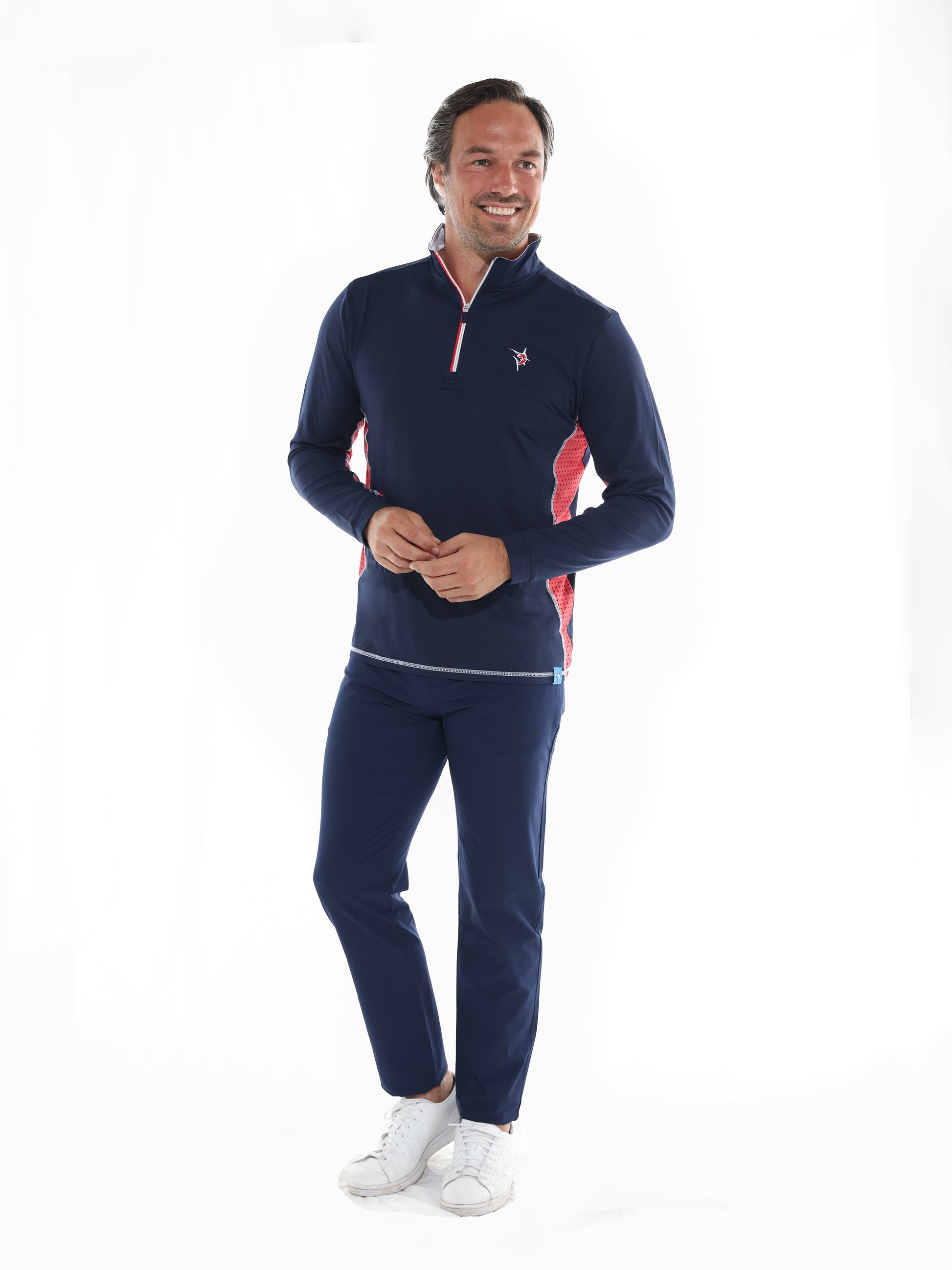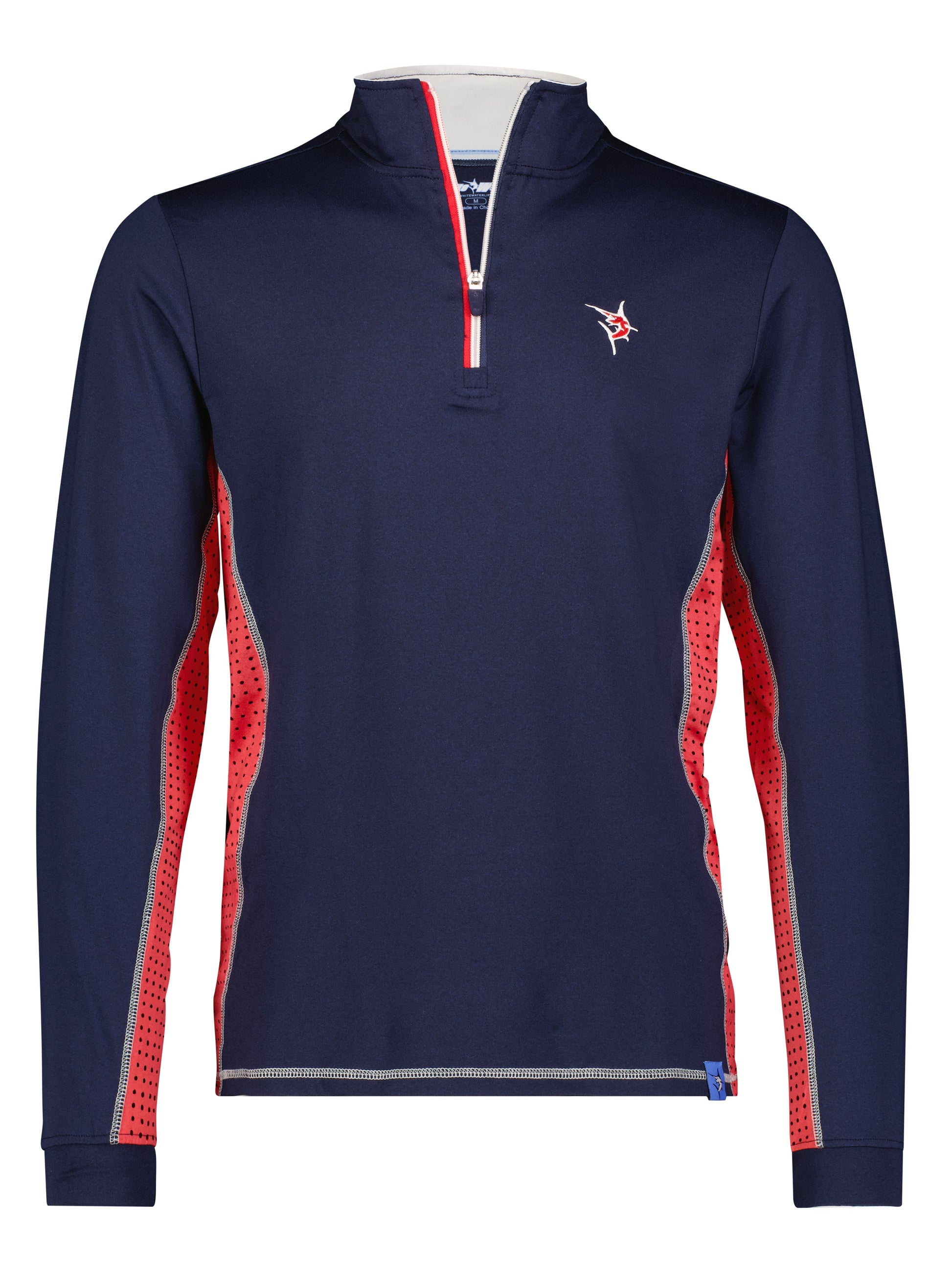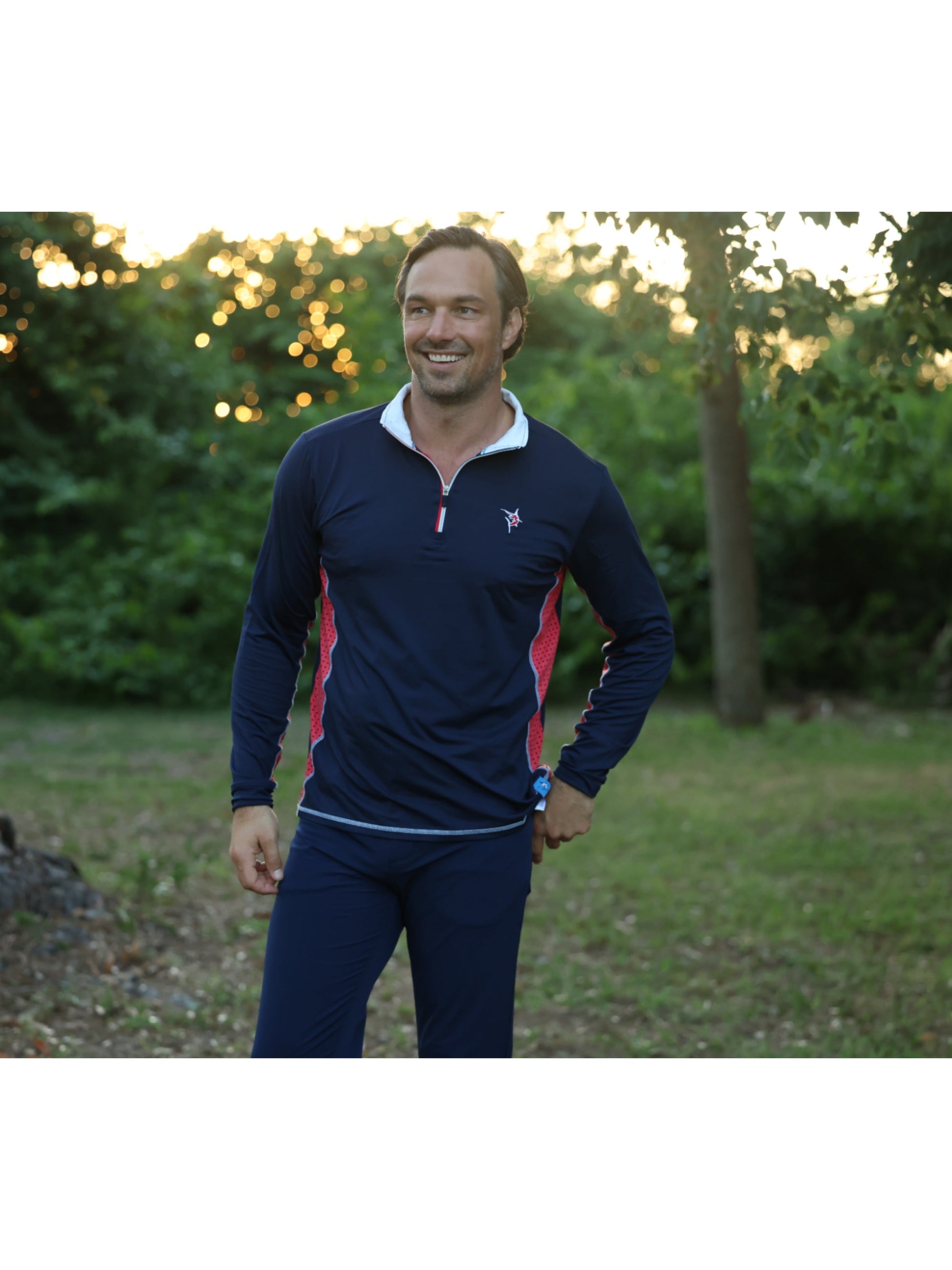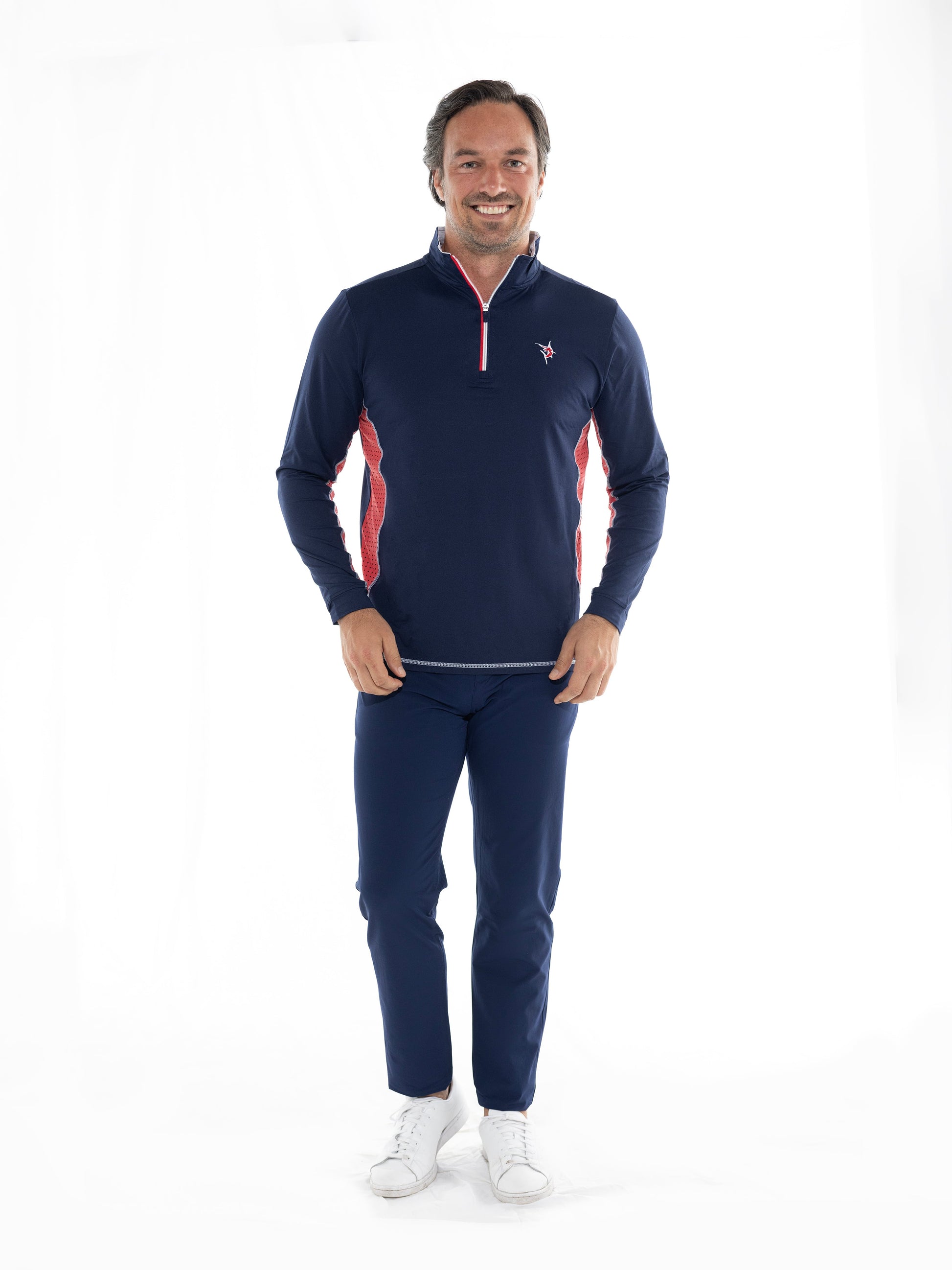 Light weight performance quarter zip featuring soft poly spandex wicking fabric. Sun Protection, UV50 with laser insert venting to keep you cool when needed and patented silicone sleeve grip which holds your sleeves in place and keeps them clean. The stylish Southport also features contrast collar, cuffs, and venting. Perfect for every day.