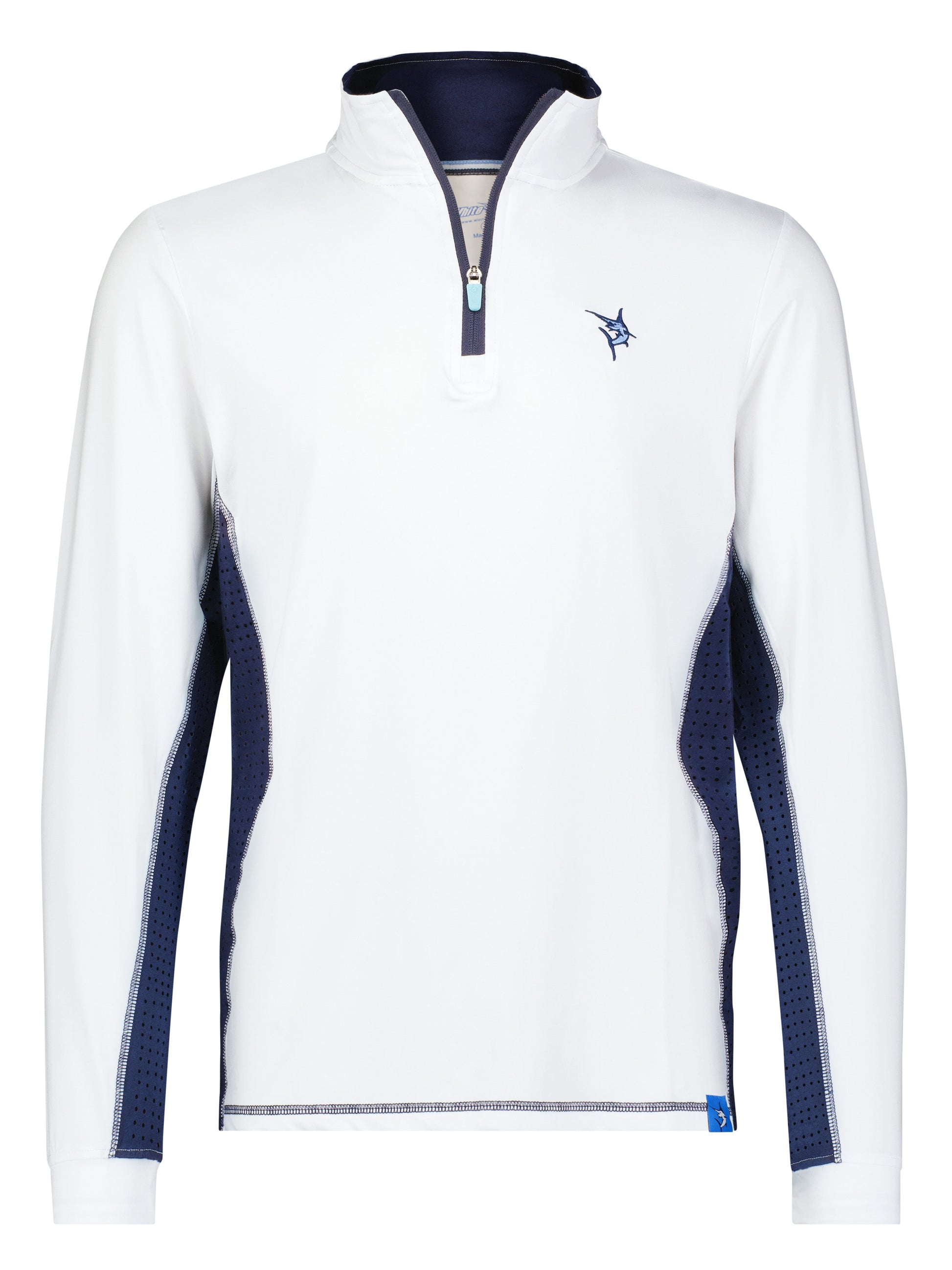 Light weight performance quarter zip featuring soft poly spandex wicking fabric. Sun Protection, UV50 with laser insert venting to keep you cool when needed and patented silicone sleeve grip which holds your sleeves in place and keeps them clean. The stylish Southport also features contrast collar, cuffs, and venting. Perfect for every day.