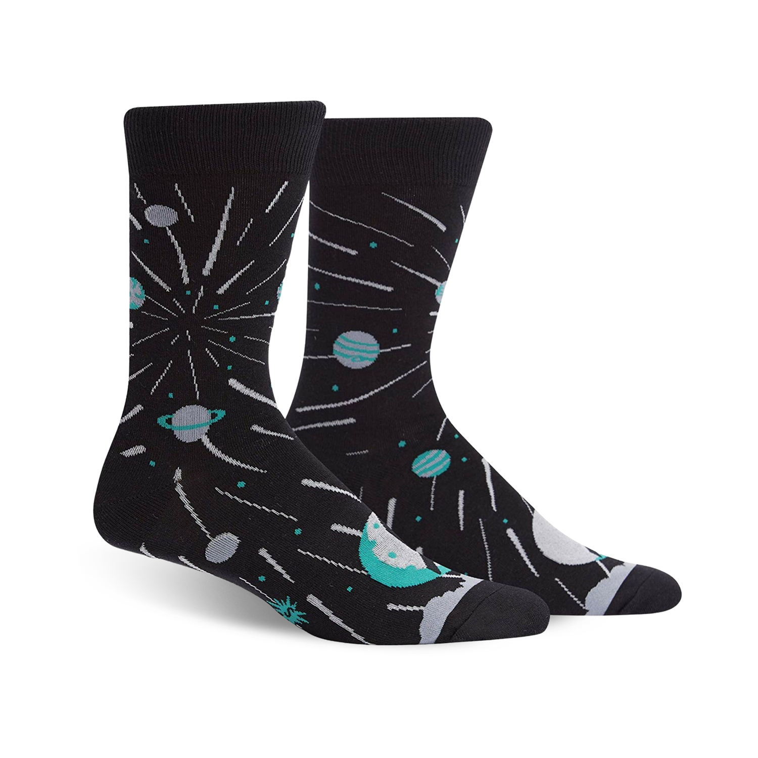 Blast off into cosmic style with our Speed of Feet crew socks for men! Featuring a vibrant interstellar pattern of planets, moons, stars, and comets on a background black, these socks are out of this world! Perfect for astronomy enthusiasts, space explorers, and anyone who loves a touch of intergalactic fun in their sock drawer.