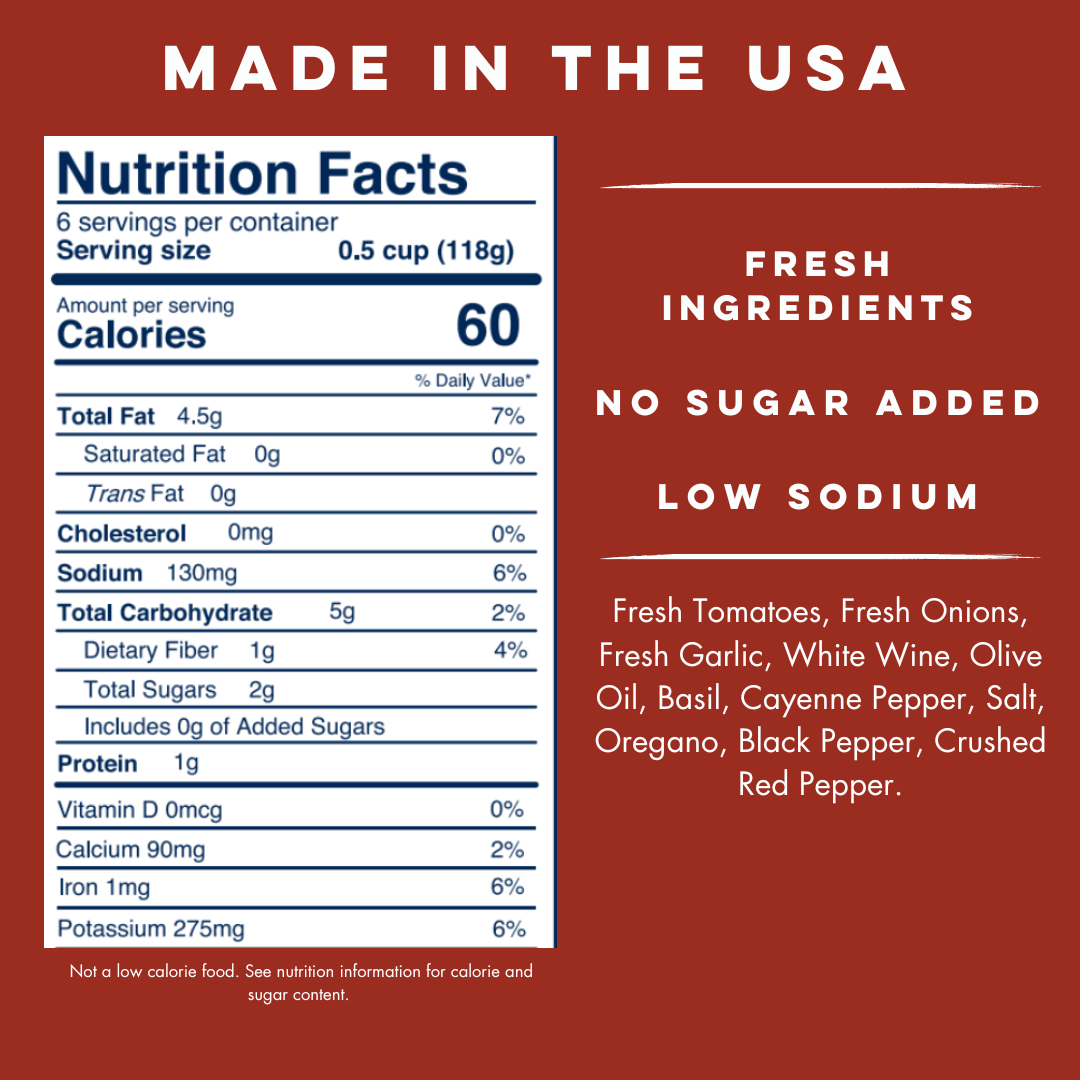 Yo Mama's Spicy Marinara is inspired by Nonna's legendary Italian recipe, with a twist. Our heritage is divinely made with fresh garden tomatoes, garlic, onions, olive oil and a combination of spices. Treat yourself to this masterpiece that contains no added sugar, GMOs, preservatives or gluten.