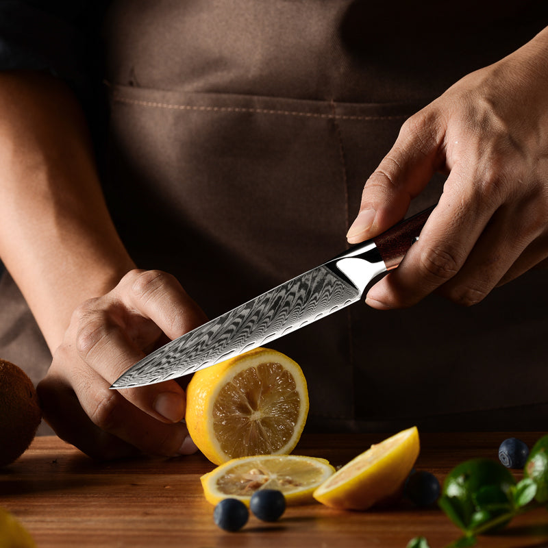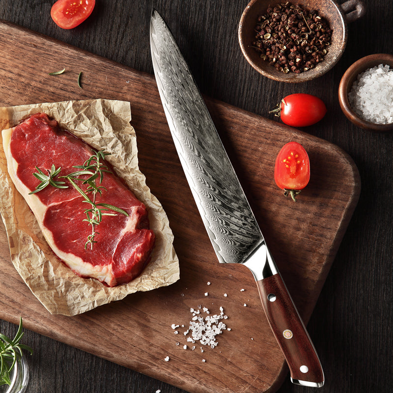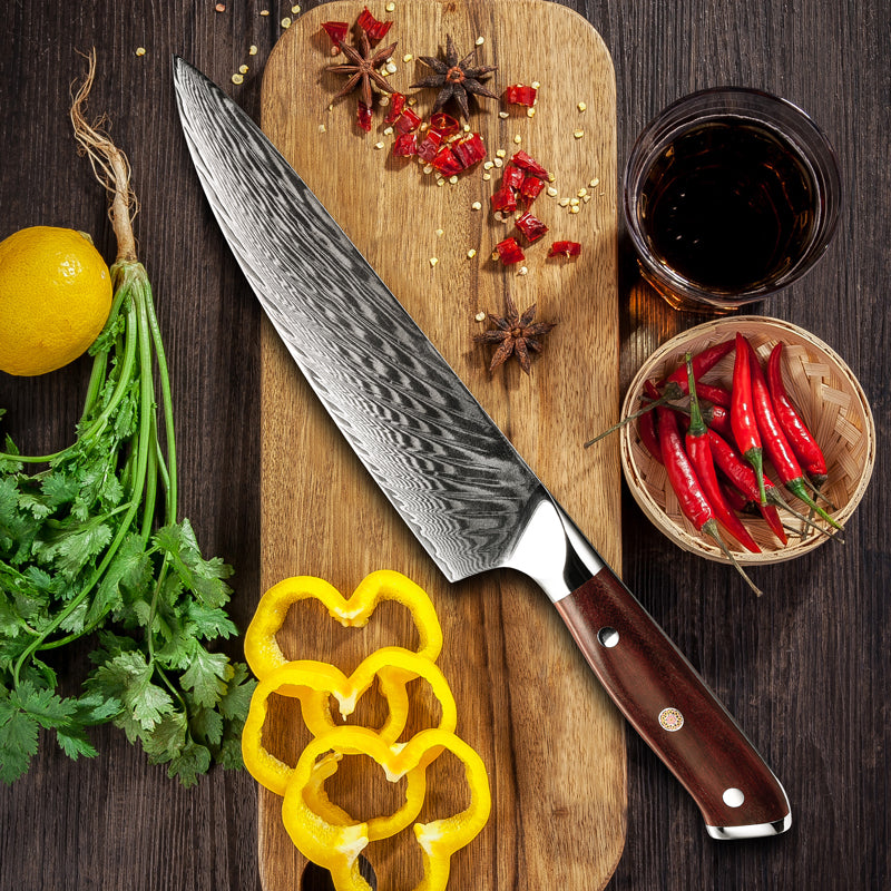 VG10 Damascus steel, renowned for its robustness, is a premium choice in knife making. It serves as the core in Damascus blades, typically layered with other stainless steels for enhanced aesthetics and performance. This steel is specially treated, oil quenched at 2100°F, and rapidly cooled twice to achieve a hardness of 58 or higher on the Rockwell scale. This process not only improves strength and edge retention but also creates the distinctive patterns that make Damascus knives highly prized by chefs and collectors alike.