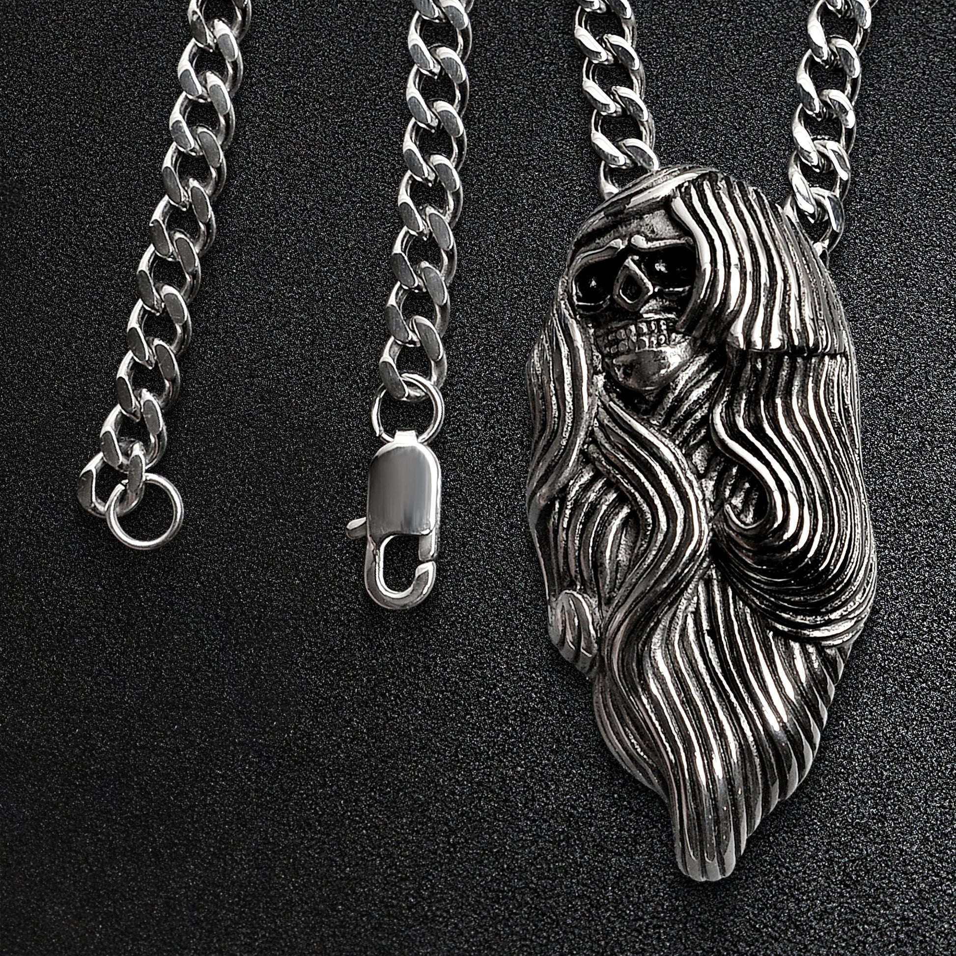 Stainless Steel Large Long Hair Skull Curb Chain Necklace