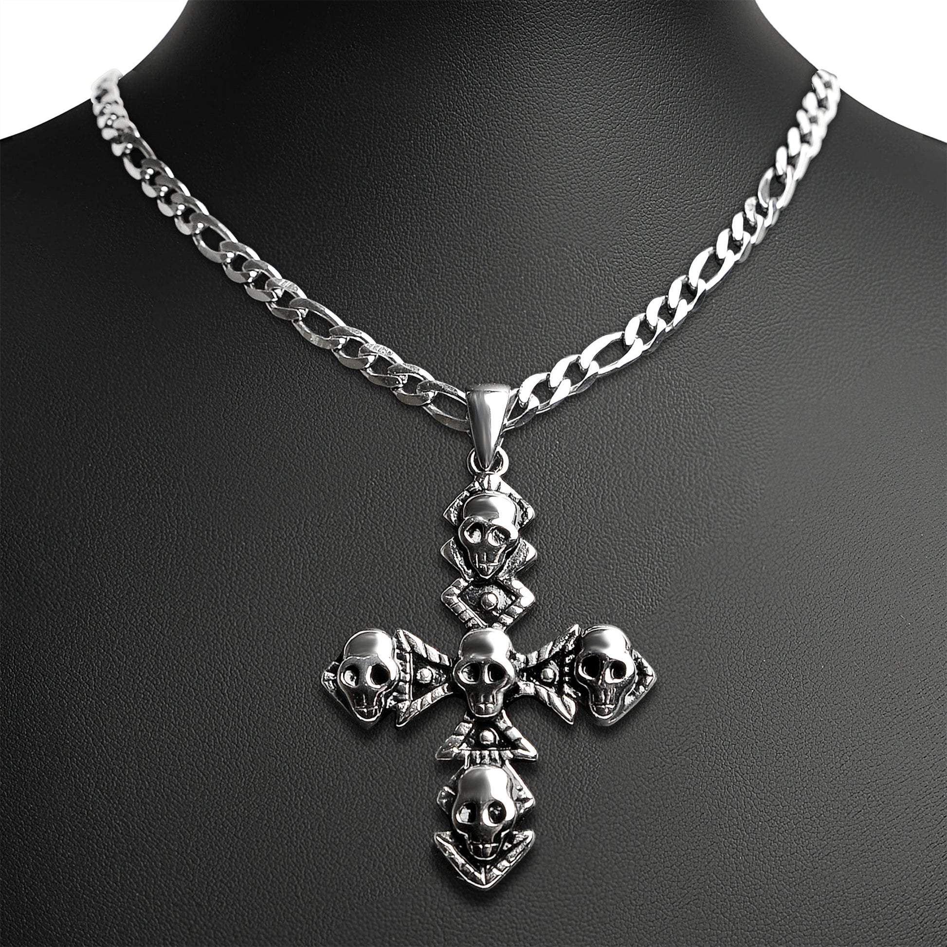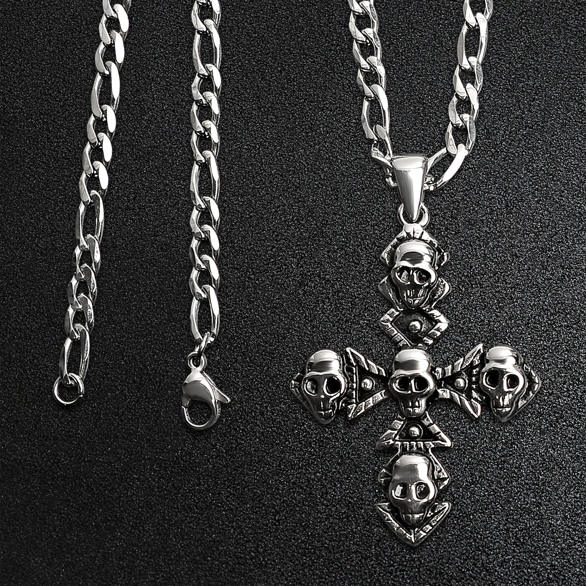 Description: Stainless Steel Multi Skull Cross Pendant Figaro Chain Necklace