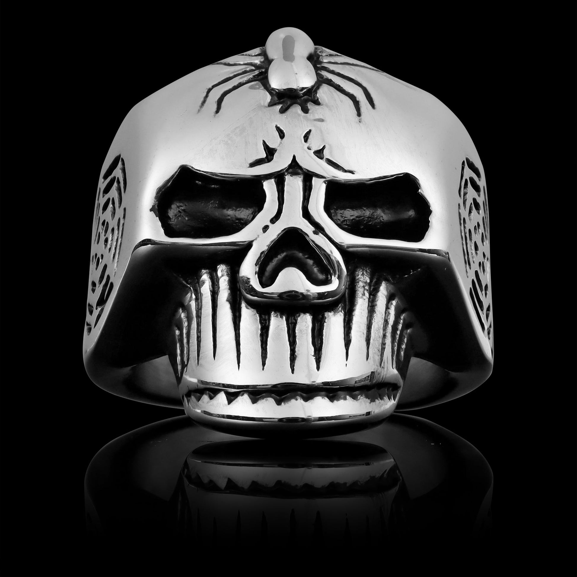 Description: Stainless steel skull with spider and web accents ring.