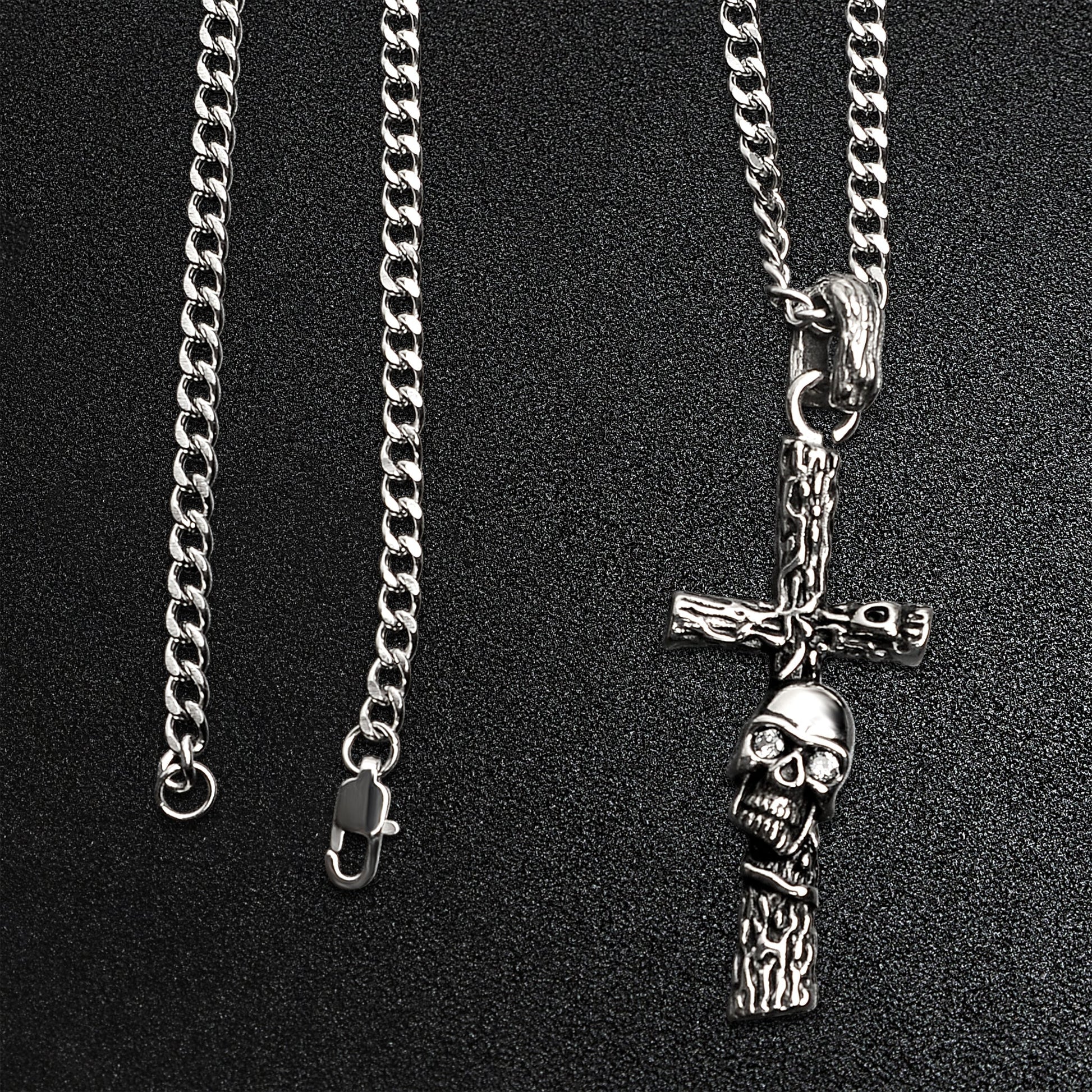 Description: Stainless Steel Wood Texture Skull Cross Curb Chain Necklace