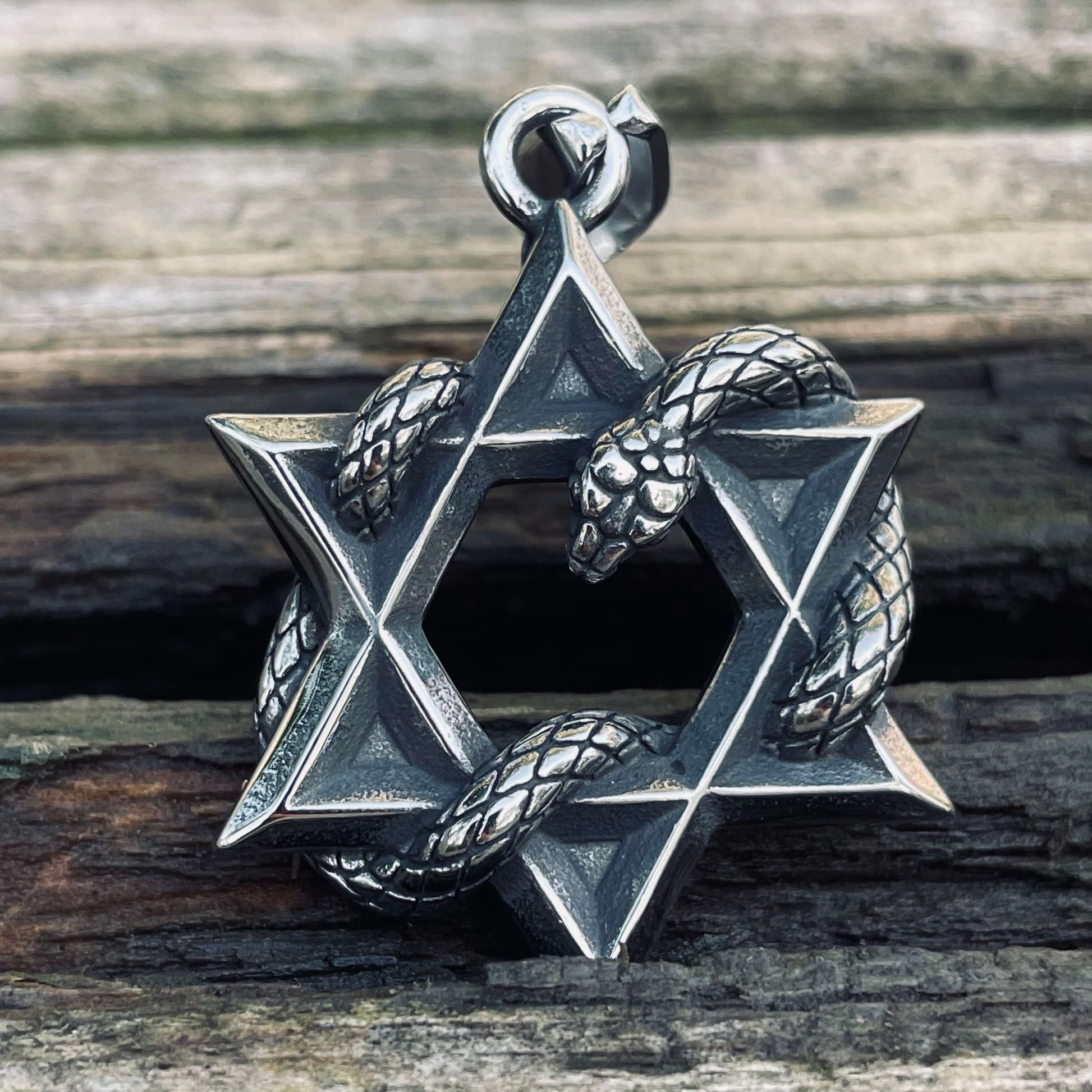 This stainless steel pendant features a unique design of a curled snake and the Star of David symbol. Made with high-quality stainless steel, this pendant is durable and stylish. Perfect for those looking to make a statement with their jewelry, this pendant seamlessly combines faith and fashion.