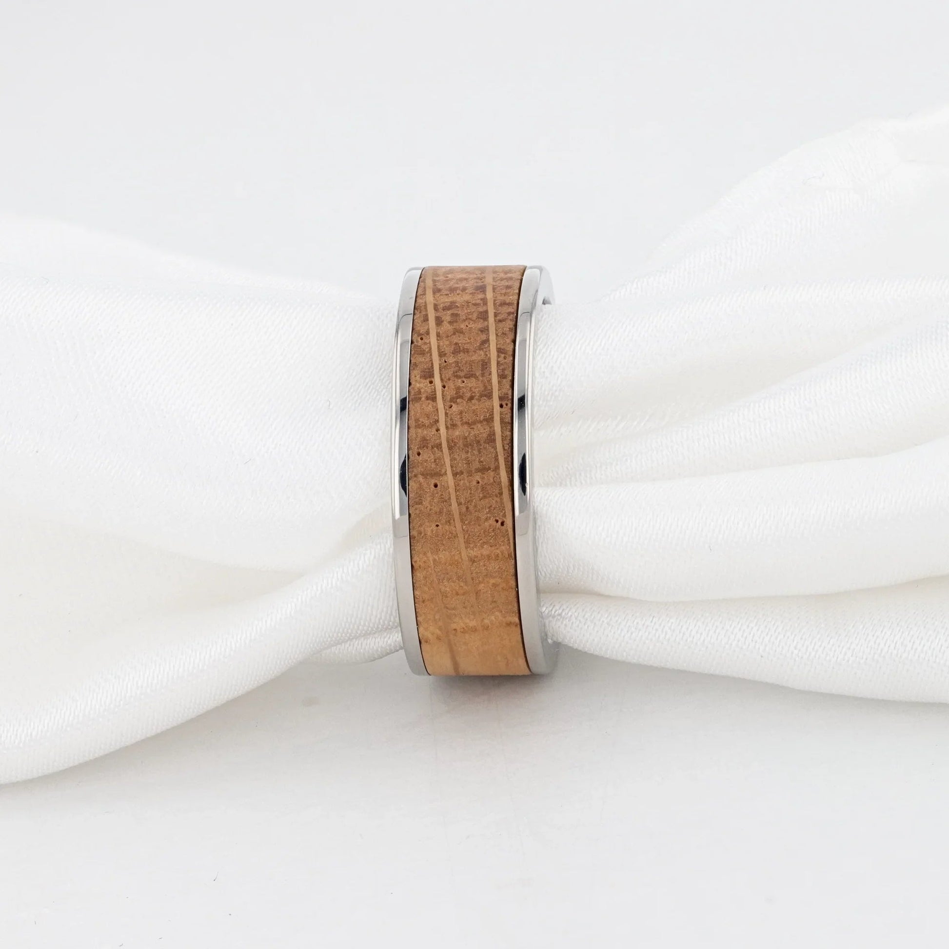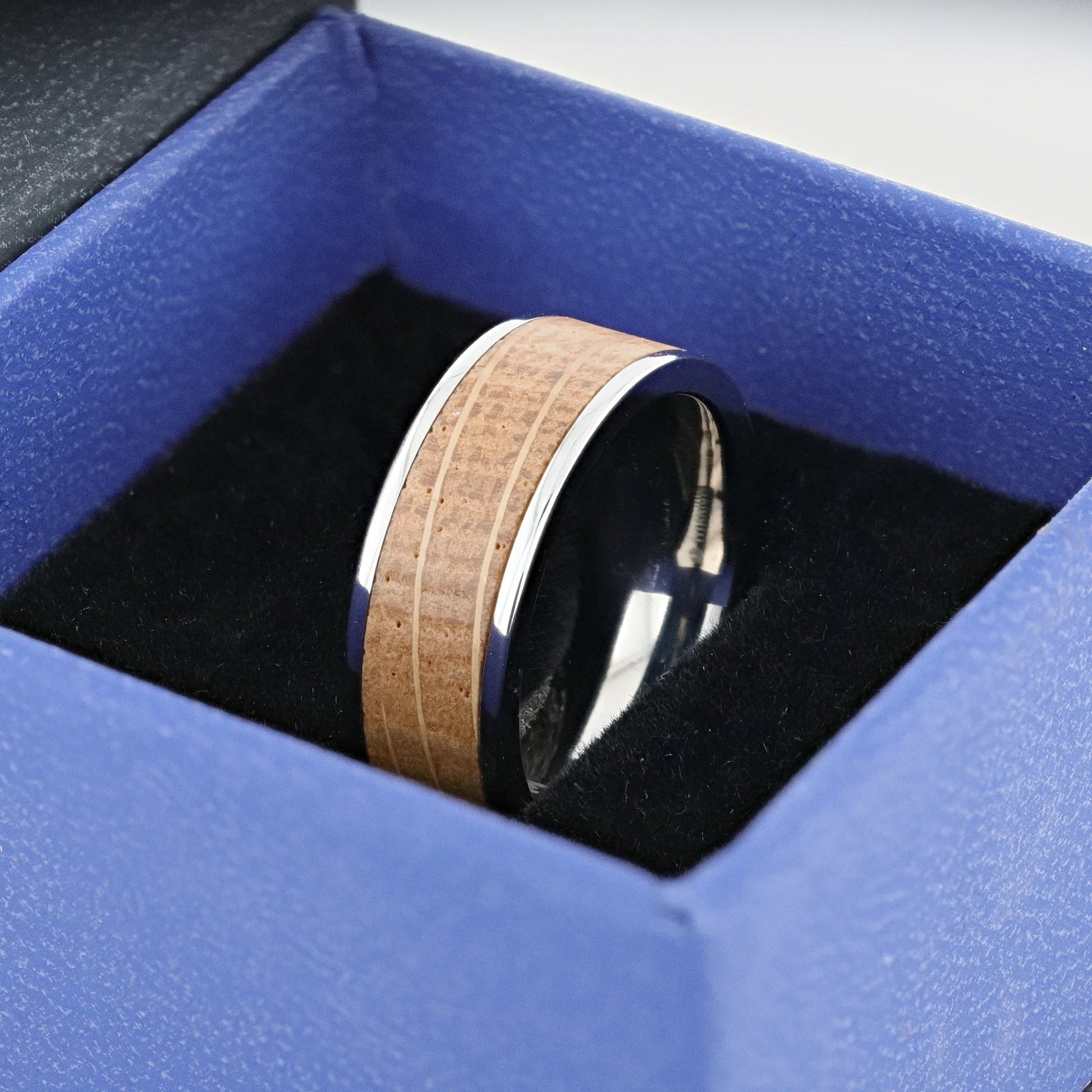 - Beautiful titanium ring with beveled and polished edges, accentuated by a whiskey barrel inlay.